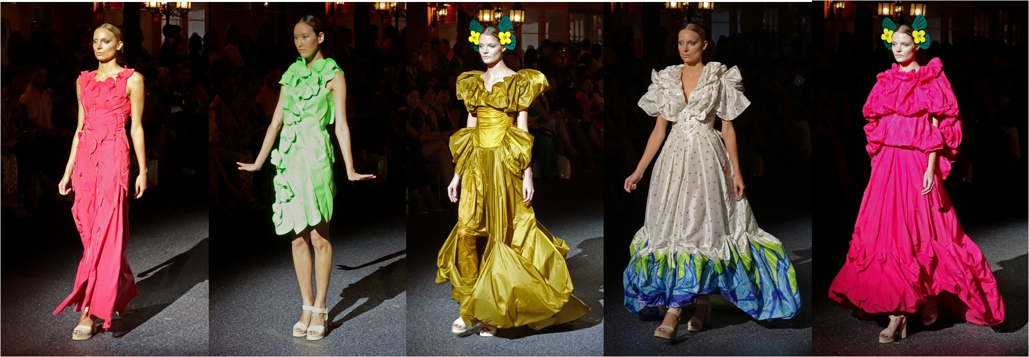 Who the target audience was for Yoshiki Hishinuma was less clear. Although his label debuted in Paris in 1992, Mr Hishinuma, who had a short stint at Miyake Design Studio in the late Seventies, started his ‘couture’ line in Paris only last spring. He is known for technological effects on textile and, at the same time, handwork. This season, he married the pretty to the progressive, using basically feminine silhouettes on which the femininity was enhanced by manipulating the shell to give the flat fabrics (organic silks, linens and cottons) life as ruffles and flounces. He was also partial to appliqués: demonstrating his preference for textures over plain weave. This very conscious attempt at creating surface effects—even on printed fabrics—so as to enhance tactile value seemed like mere decorating. In this respect, the approach was almost French, since it can be linked all the way back to 18th Century France, to the practice of Rose Bertin, Marie Antoinette’s dressmaker who was known to swag and swathe a la minute so as not to let the queen’s already large gowns look plain and dull. Mr Hishinuma’s dresses, while considerably more streamlined, looked just as over-embellished, if not over-designed. With some of the dresses, one sensed they came from the Scarlett O’Hara school of dressmaking.
