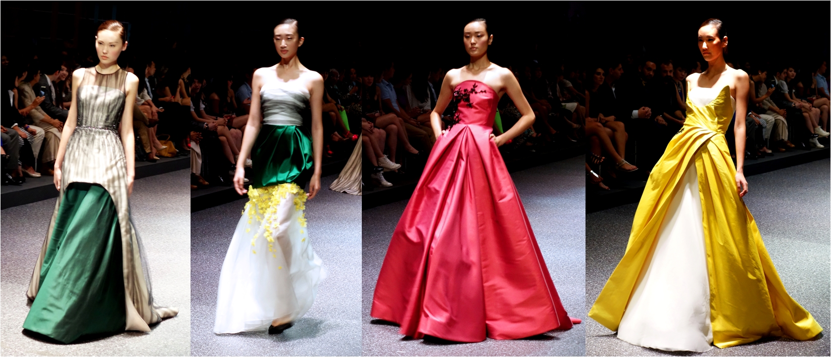 Tried as they did with varying the silhouette, their outfits did not pack a punch, never mind not breaking new ground. A form-fitting bustier dress was topped with tulle that had negligible embroidery, a fit-and-flare ball gown was designed with an inverted U-shape cutout to reveal a jewel-tone underskirt, a bustier dress with a bubble skirt that ended above the knee was finished with chiffon the rest of the way, and, to add interest, floral appliqués cascaded from where the two fabrics met like decorations on costumes of Loy Krathong beauty queens.