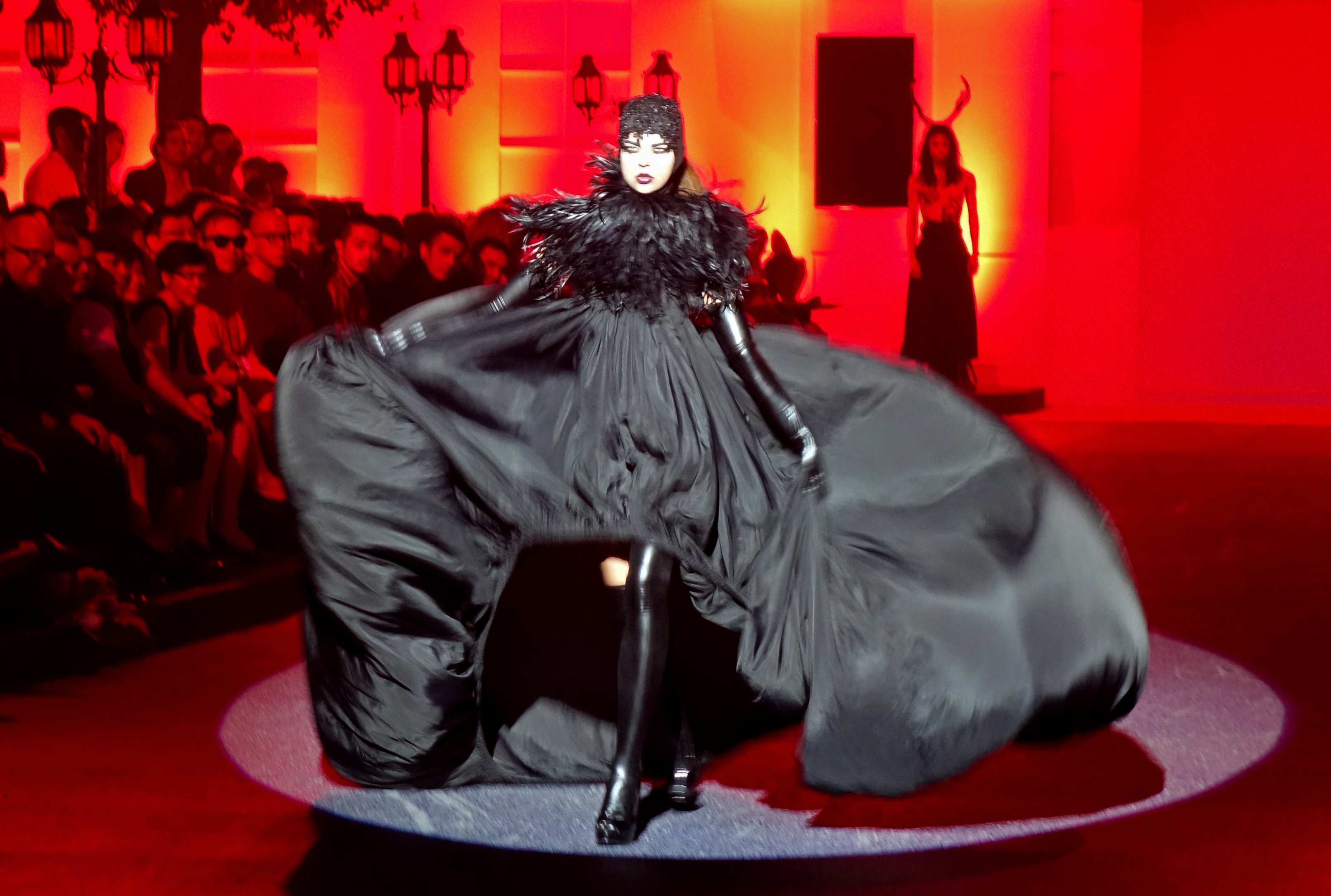 Mr Lee’s predilection for plumage is well known, even celebrated, but these were not the feathers of Maison Lemarié. Dark, epidermal, and bogged-down, they could have been the quills of predatory birds such as the vulture—a complete contrast to the kind of feather work usually associated with high fashion. Like many Asian couture designers, Mr Lee relies almost solely on the visually dramatic: his feathers had to remind you that they really came from birds. There was a floaty A-line dress with a plumed one-sleeve that slipped off the model’s shoulder, as she walked, like an injured wing; a bolero with sleeves akin to the wings of some wildfowl marauder; a multi-hued whole-bird torso that not only brought to mind Bjork’s infamous Oscar dress, but, too, the work of plumassière Nelly Saunier, whose parakeet bolero dazzled at the debut haute couture collection of a certain enfant terrible of Nineties French fashion; and the final number: the Egyptian god of rebirth and creation Khnum emerged as a female deity with wings! Or, for gamers of today, a creature out of Final Fantasy? Sharp fashion observers will, no doubt, recall a certain jacket from the Spring/Summer 2010 collection of a certain London-based Serbian designer.