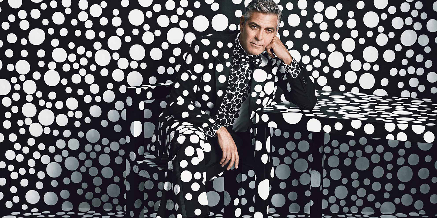 Most unexpected is George Clooney’s appearance in the December issue of W. One of People’s “Sexiest Men Alive” and Nespresso’s female magnet, Mr Clooney looks like he was dressed by his grandmother when, in fact, what he has on was dreamed up by 84-year-old Japanese artist Yayoi Kusama, a woman who is fond of camouflaging herself in dots (or tentacles patterned with dots) . But these are not the dots of Roy Lichtenstein; these are huge dots, of unequal sizes and appear to be bubbling up. On the cover or in the pages within, the actor looks like a well-upholstered prop of an art installation that is whacky and cosmic and brimful of unknown meanings.