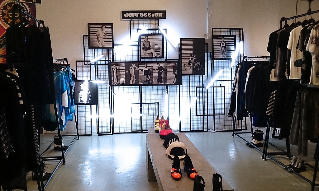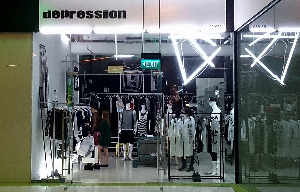 Later, over at the main store in Cineleisure Orchard (above), Depression did not look more heartening. I thought that since the clothes were shown in its own brand environment, they could open me up to why the garments look the way they do. Traced to the mother ship, they appeared as “raw” as they did in another outpost. A corner shop of painted concrete with scaffolding on which the garments hung, the boutique befits the commonly held belief that Depression is a “cult brand”. The clothes—mostly black and white—inhabit a room that is crudely industrial, lacking in seductive VM, and unevenly illuminated. Why is it that an indie label—another tag oft-ascribed to them—must look like a struggling brand in order to win street cred and designer standing? Mr Lim has described Depression as “avant-garde”, even when he has stated that he does not go for differentiation. Avant-garde, interestingly, is often a euphemism for something that cannot be satisfactorily defined; it has the same effect as calling a hodgepodge interior “eclectic”!