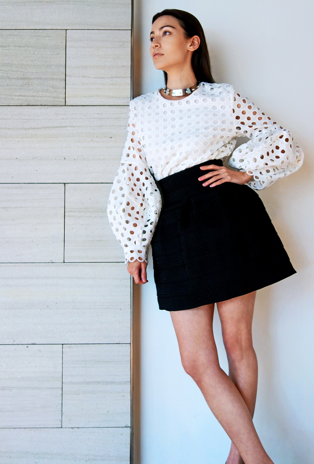 Perforated poly-blend blouse with lantern sleeves and bell-shaped, banded miniskirt