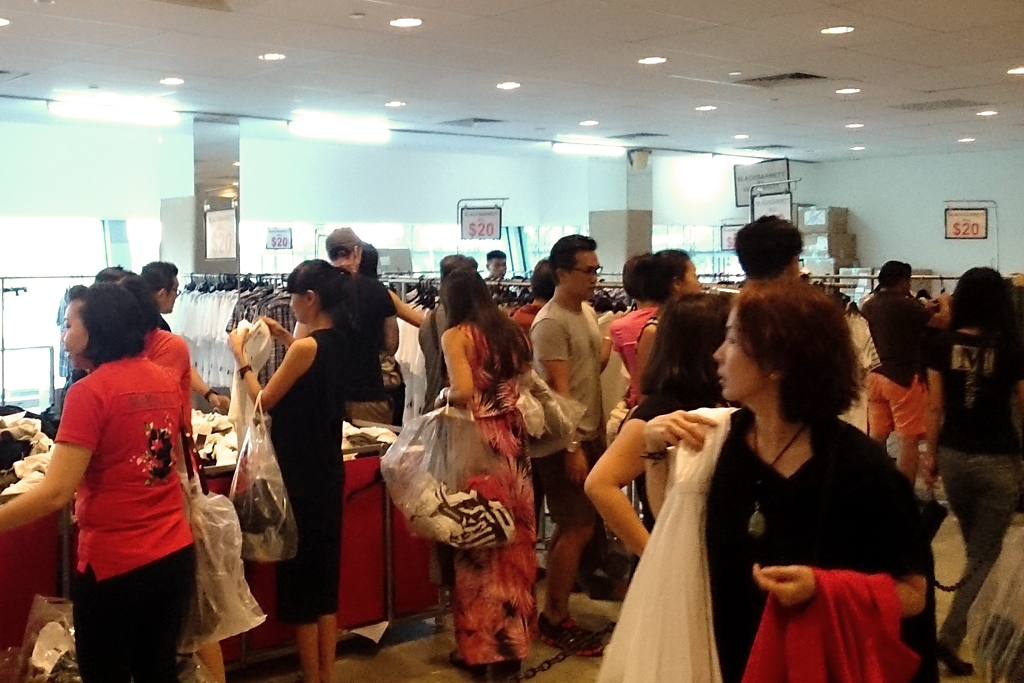 Waiting to cross the traffic lights from Millennia Walk on Temasek Avenue, I could see, right ahead, the queue stretching across the entire length of the second floor of the Pit Building. Normally, as the name suggest, this would be the nerve centre of the world’s most famous Grand Prix, but on this day and for the next four days, it would serve as the disposal point from which one of Singapore’s largest fashion retailers will clear old stocks. A woman with a trolley bag too big to be allowed into any aircraft cabin was impatient for the light to turn green. She asked her companion in Chinese, “What if everything is gone by the time we get there?” The prospect of losing out is a damper more disheartening than queuing in the stifling afternoon heat for a length of time, quite unnatural for the purchase a few discounted frocks.