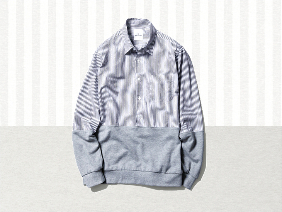 Regular readers of our blog will no doubt realise that we have a weakness for classic clothes with a Japanese spin. Here’s another one: a shirt-meets-sweat-top combo by Tokyo-based label Uniform Experiment. As seen above, this is quite simply a shirt of striped cotton broadcloth atop the bottom half of a cotton sweat top. The sum of the uncomplicated parts leans toward the current obsession with athletic wear, yet the reference is not in your face. And that’s the beauty here: it’s wearable quirk. There’s also the likely reaction to donning this: “what kind of shirt is that?” And the rejoinder could be, “One with a split personality disorder!”