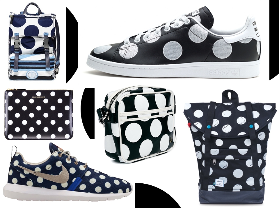 To us, polka dots are evocative of Mini Mouse’s dress and, inevitably, the oversized bow on her hair: clearly a cartoon celebrity in need of Smurfette’s stylist! They, too, remind us of Comme des Garçons, a label that has made repeated dots attractively modern. In all sizes (big, apparently, is better), they have been very much a part of the CDG graphic arsenal, and they appear in almost everything, such as those Croc-like slip-ons in collaboration with Native Shoes back in 2013 as well as those season-less Play cardigans worn by stars such as Justin Timberlake. That’s why, to us, Pharrel William’s new iteration for adidas Original’s Stan Smith (above, top right) is nothing new (the dots are embroidered on the leather upper, an idea first seen in Dior Homme shoes last season). It is really not beyond the ken of the average fashion follower that he took a page from the CDG playbook (perhaps to score extra points so that those shoes can be carried in Dover Street Market) rather than dream the pattern up.