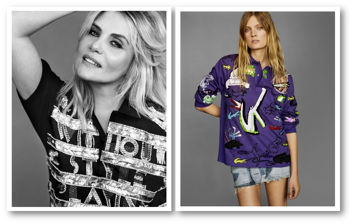 Left: actress/singer/model Emmanuelle Seigner wears ‘Without Style, Playing and Winning is Not Enough’ Lacoste X Lesage polo shirt. Right: model Constance Jablonski in a long-sleeved ‘René Graffiti’ Lacoste X Lesage polo shirt