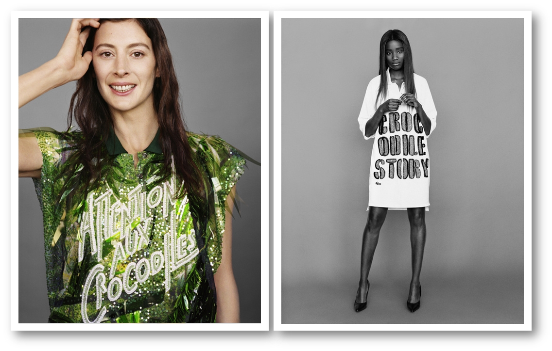 Left: actress/model Laetitia Casta wears ‘La Véritable’ Lacoste X Lesage polo shirt. Right: model Cora Emmanuel wears ‘Games, Set, Match’ sleeveless Lacoste X Lesage polo shirt