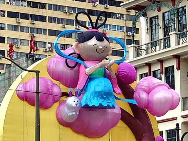 I have to admit that my idea of beauty is informed by my early, pre-pubescent acquaintances with Bessie and Fanny (The Enchanted Forest) and Nancy Drew (of her own eponymous series). But that does not mean I didn’t later learn about ancient Chinese beauties. I know they don’t look like the two Chinatown delineations. Before stealing the elixir of immortality from her husband, drinking it, and flying to the moon, Chang’e was an earthly beauty that was renowned throughout China. She was known to have skin the colour (and smoothness?) of milk, hair as black as night, and lips as pink as cherry blossoms. In art (and mooncake packaging, on which we now mostly see her depiction), we take in a regal woman in elegant, flowing robes. At this time, Chinatown, as The Straits Times wrote, is “aglow”, but, sadly, there is nothing glowing about this year’s dumpy Chang’e.