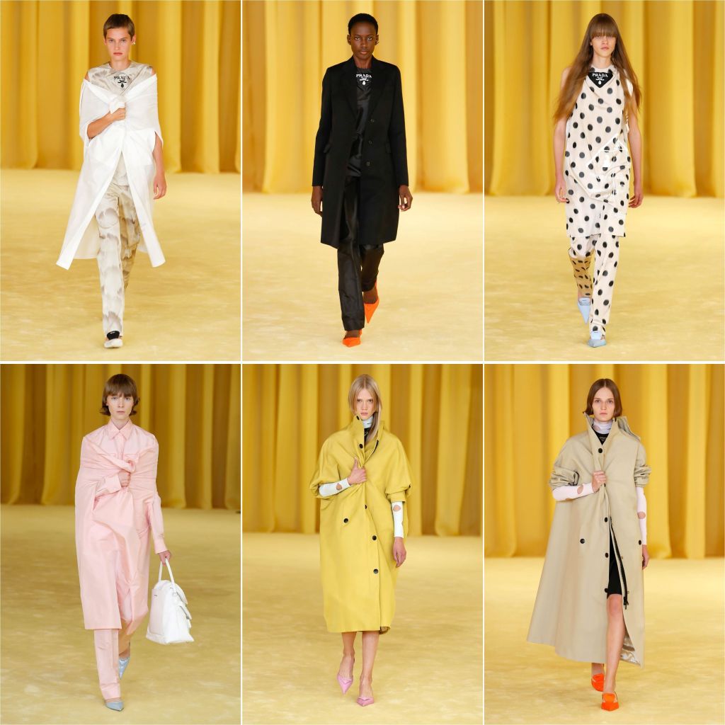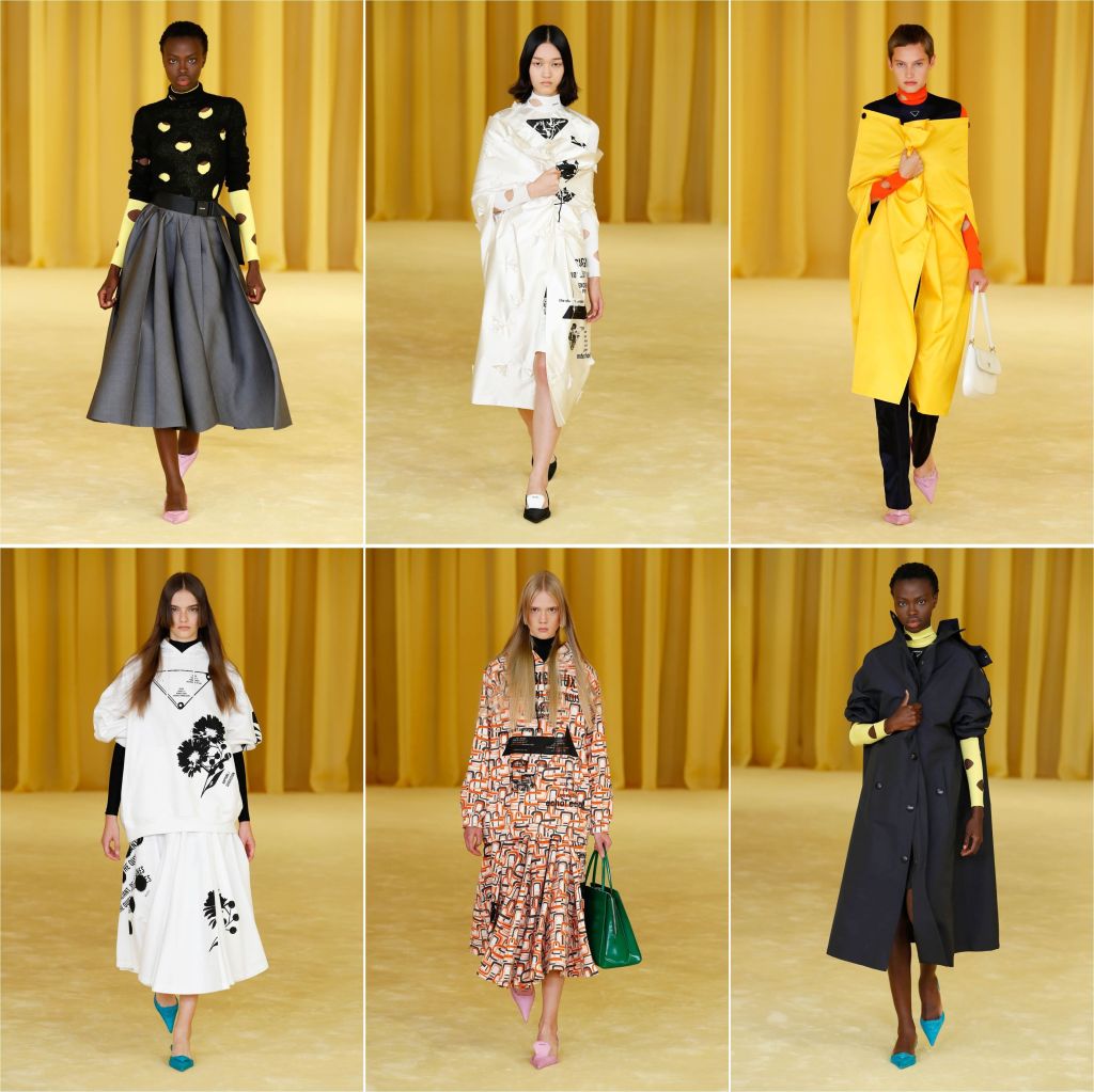 The show, filmed in what appeared to be a studio, was stripped of the conceptual sets that used to give Prada collections context. This time, it was just yellow (lemon, canary, fall gingko leaves… take your pick) curtains for the background, a similarly coloured pillar and floor, creating a patina of sunshine and optimism. There were camera rigs grouped in five (above each camera a flat screen) and mounted on a frame suspended from the ceiling. The set-up spoke of function and straight-to-the-point. The models catwalked and engaged the camera. If this is the future of digital fashion weeks, we really welcome it.