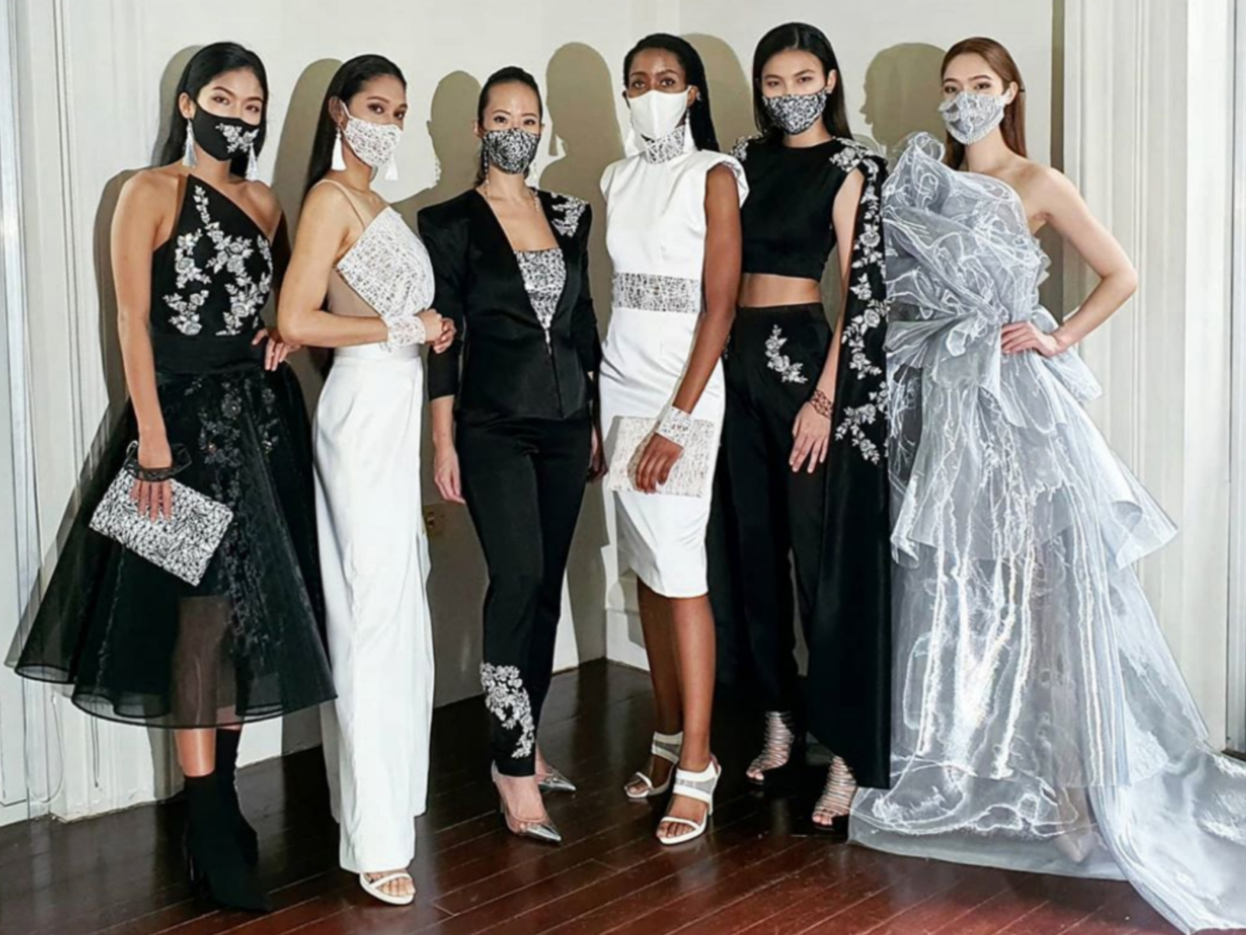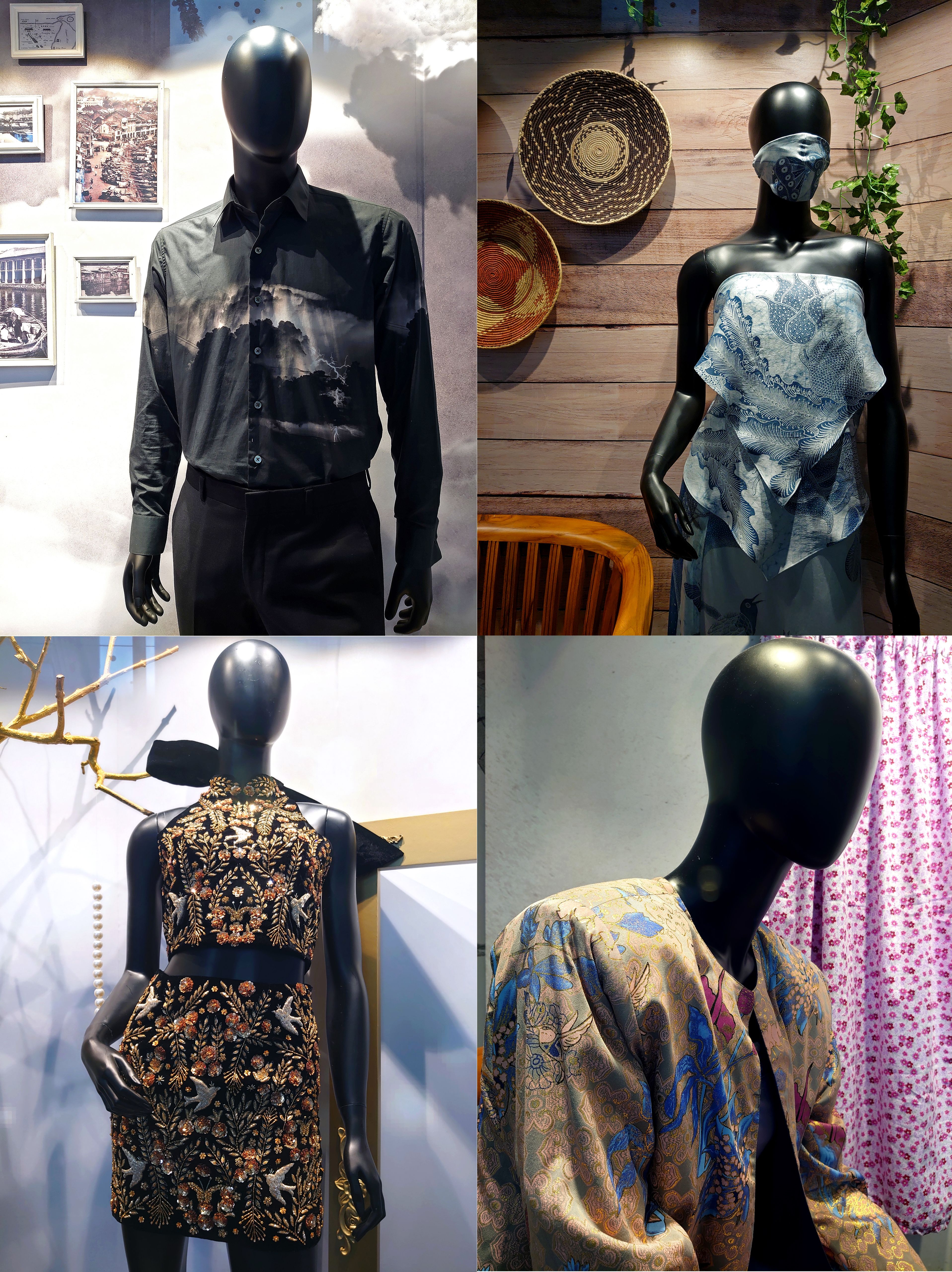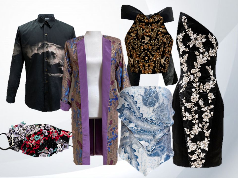 Up close with great designs? From left: shirt by CYC’s Claire Chiang, face mask by Carol Cheng, coat by Nude Femme’s Adelyn Putri, embroidered top by Nida Shay’s Nida Tahir Shaheryar, strapless top by martha Who’s Mette Hartman, and dress by Carol Chen. Product photos: One Orchard Store