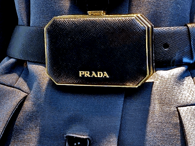 When we examined it, this is really an elegant and dainty version of a waist bag. Or one of Prada’s “belt with pouches”. As seen on the runway (when IRL was still normal), the belt/case goes well with a suit. We can also imagine it over a sweater, with jeans, or to cinch a Prada Re-Nylon pinafore. Is the belt buckle too big? Not to us. We don’t think it’s larger than those that cowboys (and cowgirls) wear (which, as we understand it, are symbols of accomplishment in areas such as barrel racing, bull riding, lassoing, etc).