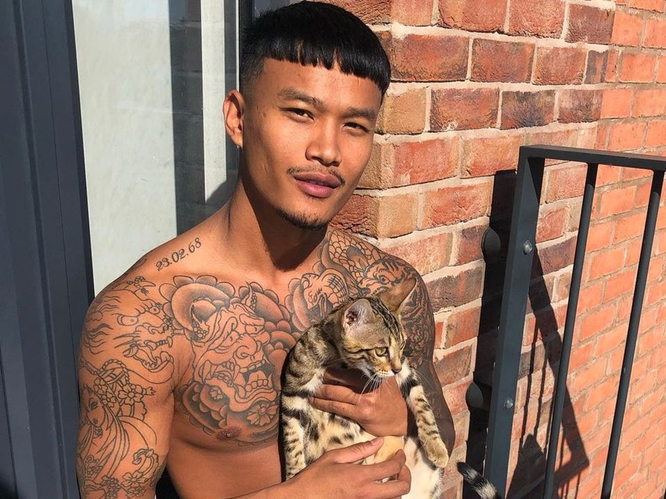 He is tall: 1.83m, according to his London men’s-only agency Supa Model Management. And he has those sprawling tattoos, which spread across half his upper body and down both arms. A yakuza would be duly impressed. In many of the photos shared on social media, Mr Sakraew has a pai kia (bad boy) intensity about him and is often dressed in what he calls “sporty look”, but to posh Londoners, might be considered a tad chav. Even if not quite major among Bangkok fashion folks, his appeal is gaining traction among those in the gay community who “like them blue-collar looking or na hia hia (natural ‘rough-looking face’, with no makeup)”, as a graphic designer told us, and those who consider Mr Sakraew as aroi (delectable) as som tum (papaya salad), a dish with origins that can be traced to Issan and Laos. Newfound fans find his red-blooded provincial vibe charming as it contrasts with another trait: the guy loves cats!