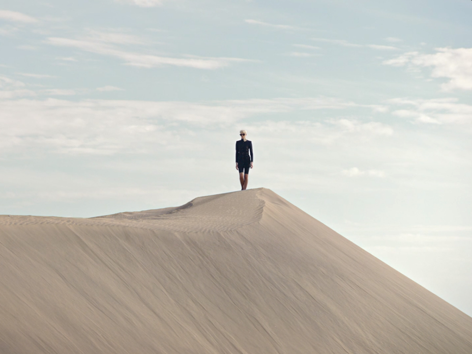 The Saint Laurent show takes place atop a sand ridge in the Sahara (presumably), perhaps vaguely alluding to Yves Saint Laurent’s own exotic North African roots (he was born in Algeria). However, the house isn’t the first to show in a desert—in 2007, Pierre Cardin showed on the desert of Whistling Sand Mountain in Gansu Province, China. Still, it’s intriguing to see how a runway show could be set up on what appears to be pristine sands, taking into account that they are loose, and likely to shift. Even the YSL logo could be, somehow, worked into the vast slipface of a dune, creating a considerably austere, but no less striking branding of the house. When the models finally appear, emerging from a peak, like Bedouins (perhaps Frank Herbet’s Fremen, too?) coming home, but well socially distanced, we realise this is no mirage: Saint Laurent is bringing its clubby clothes to the desert.