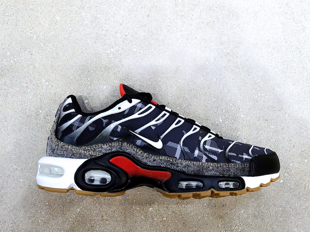Nike’s new Air Max Plus Tuned 1 is a jolly mix of patterns and a strip in the texture we associate with jeans