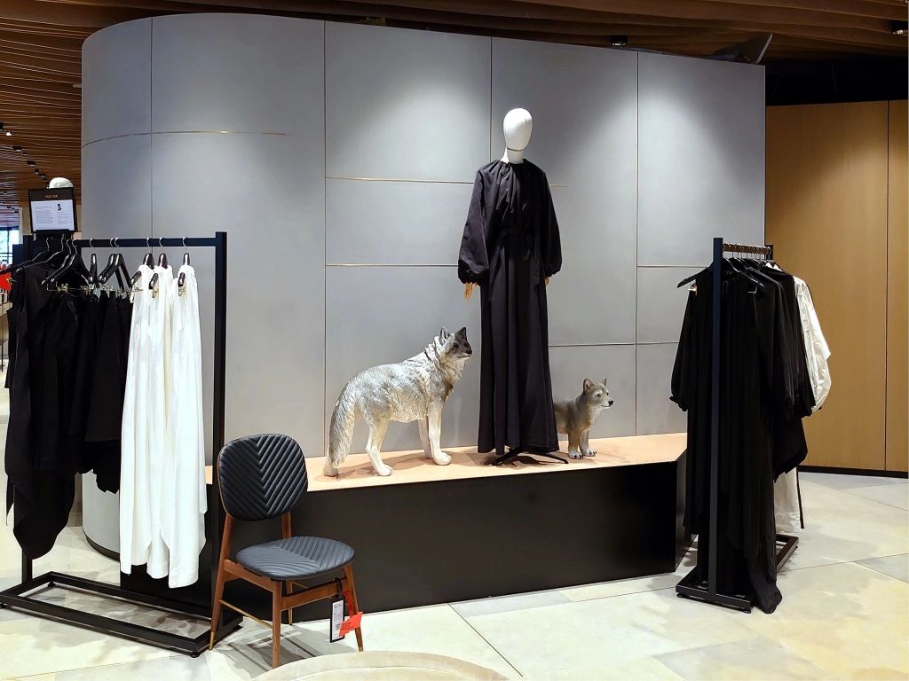 The sizeable Thomas Wee collection takes up a space in an extreme corner of the store, on the opposite end of the main door, at what was another entrance (or rear exit) until the COVID-19 social-distancing mandate required stores to have a single point of entry and exit, to better control and monitor shopper movement. What Mr Wee is assigned is rather unusual in that, based on our earlier understanding, brands are not usually allotted their own designated spot. Within the roughly 50-square-metre corner, with a street-facing window, Mr Wee has set up shop in a layout that feels familiar: simple racks, headless mannequins (five of them—more than the other labels), the largely monochromatic scheme, a bench, which appears to welcome resting—a sum that hints at the elegant simplicity of his clothes. If not for the distracting UOB logo on a lightbox from next door, this would be a corner that could easily induce the appreciable description, cosy.