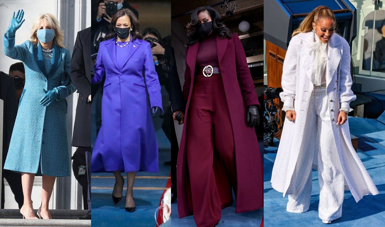 Topcoat day: (from left) Jil Biden, Kamala Harris, Michelle Obamam, and Jennifer Lopez. Photos: Getty Images