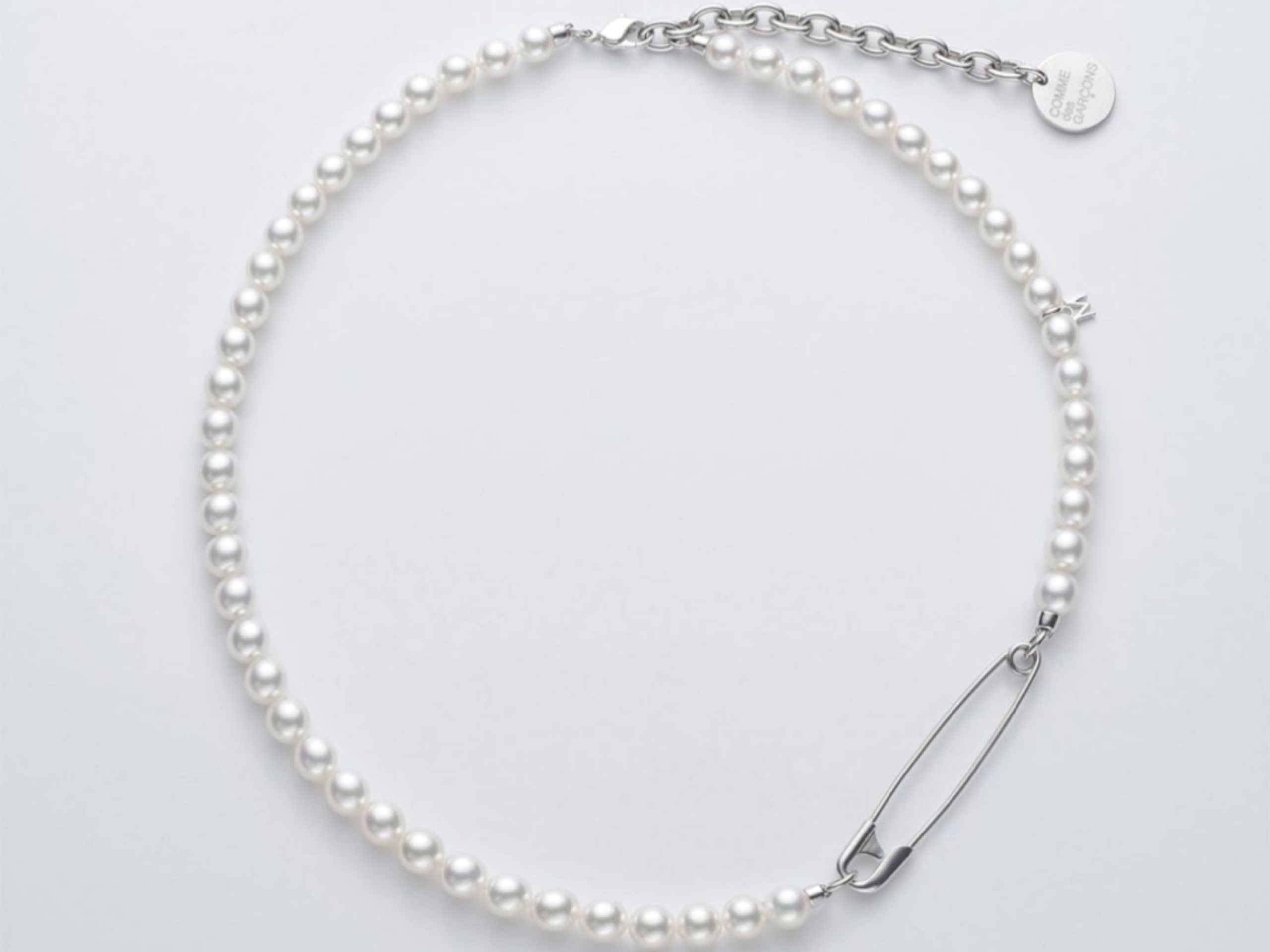 Perhaps that’s the whole point of pearls these days: to not fit in. Surely they can be styled to bear street cred, just as much as they can be part of any guy’s tailored best. Just look at the pearl collection of Comme des Garçons, conceived with the 128-year-old Japanese house of Mikimoto (above) since last season. It could be discerned that Rei Kawakubo has introduced something punk and subversive into otherwise very conventional strands of pearls. CDG does not indicate which gender the jewellery is targeted at, but in the joint marketing campaigns by the two brands, male models wore the pearls, with one fellow sporting a double-strand over a tie and under a suit jacket with peaked lapels. The aesthetic base is still elegant, but the saltwater akoya pearls seemed to turn away from the conventional, like wildly patterned socks under pin-striped trouser legs. CDG, as we know, doesn’t really do anything vanilla. With a ‘classic’ material such as pearls, they’d want to introduce a counterpoint to the poshness. So there are the sterling silver hardware, such as chains (which are rather Virgil Abloh, even Yoon Ahn, and have been similarly employed at Maison Margiela), studs, and safety pins, all used as decorative trims, like in CDG’s RTW, but presently looking less fierce than they had been.