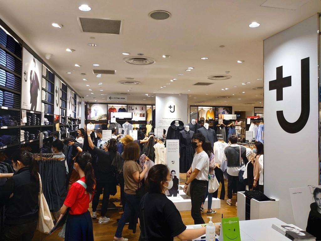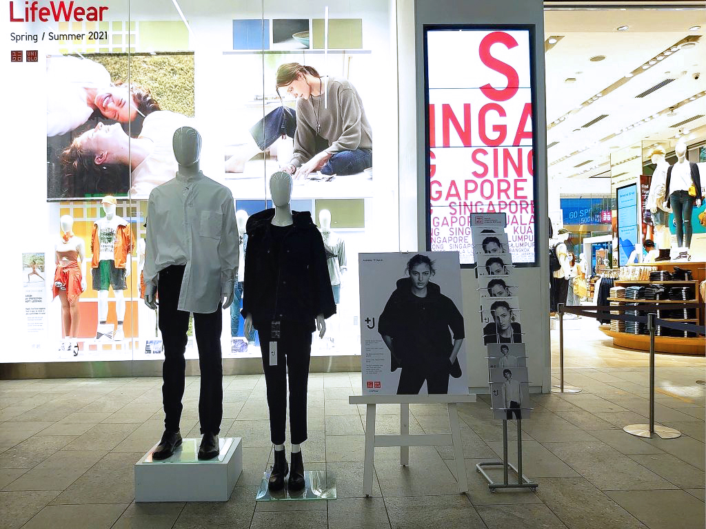 Like during the day of the launch last year, a holding area was set up on the connector-bridge that, pre-pandemic, would have led to Orchard Gateway. But unlike the previous occasion, black stools that looked like Ikea’s Marius were now available for the waiting to be more comfortable. And those in this space need not while away the time on their smartphone for long. Shoppers in the +J retail zone were given only half an hour to pick up what they desired (which recalled similar time limits at the launch of H&M’s designer collabs). To help them make the most of the 30 minutes, the +J catalogue was distributed prior to entry, but not many wanted it (later, it could be seen disposed in the bins throughout OC, and even further away at Takashimaya Shopping Centre). Once inside, there was a maximum of 20 shoppers allowed, which made for reasonably comfortable browsing and selecting. Staff manning the line had served the reminder that no more than five pieces for purchase per person was permissible, and no more than one per style (but another colour was allowed).