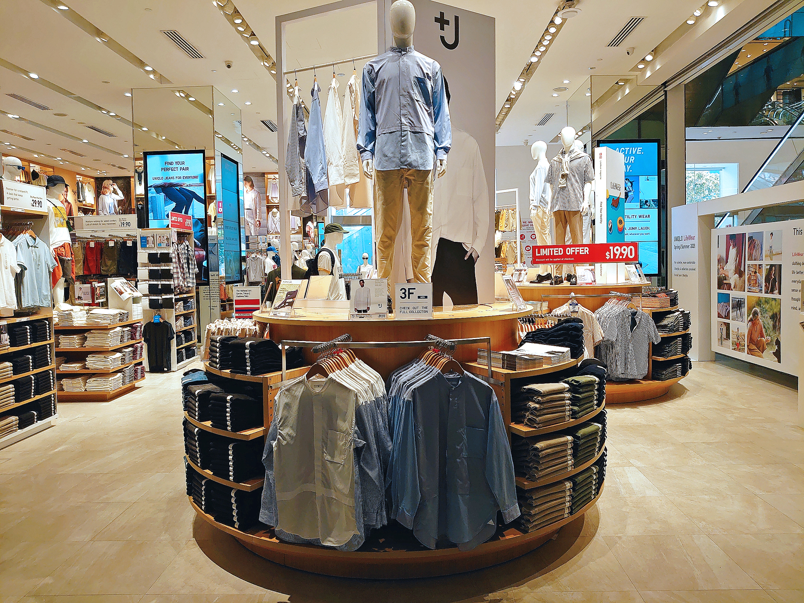 Like during the day of the launch last year, a holding area was set up on the connector-bridge that, pre-pandemic, would have led to Orchard Gateway. But unlike the previous occasion, black stools that looked like Ikea’s Marius were now available for the waiting to be more comfortable. And those in this space need not while away the time on their smartphone for long. Shoppers in the +J retail zone were given only half an hour to pick up what they desired (which recalled similar time limits at the launch of H&M’s designer collabs). To help them make the most of the 30 minutes, the +J catalogue was distributed prior to entry, but not many wanted it (later, it could be seen disposed in the bins throughout OC, and even further away at Takashimaya Shopping Centre). Once inside, there was a maximum of 20 shoppers allowed, which made for reasonably comfortable browsing and selecting. Staff manning the line had served the reminder that no more than five pieces for purchase per person was permissible, and no more than one per style (but another colour was allowed).