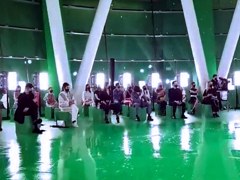 The 7.30pm online show was touted as a “livestream”, but the version posted on the LV (SG) website appeared to have been filmed earlier. Those who sat in front of their PCs or held their smartphones to watch saw not a performance glitched by a downpour, but a laggy video (that froze repeatedly at start), with sometimes choppy sound, and editing that appeared to deliberately create a low-tech effect that recalled music videos of the early ’80s. At the show venue, the soundtrack was suitably thumping and loud, but that did not drown out the vibe of a presentation that barely trifled with the thrilling, or enthralling. We had to remind ourselves that this was a spin-off, not a reproduction of the striking show held in the French department store La Samaritaine last October. The presentation looked totally unrecognisable. Green (to be keyed out later for video effects that were, at best, superfluous) dominated the space, not Art Nouveau and Art Deco architecture. The clothes—67 edited looks in all—were pieces from the spring/summer 2021 collection and a separate summer capsule, worn on models unfortunately without the experience or the vim to bring out the wondrousness of Nicolas Ghesquière’s designs. If the cascading water was a welcome droll to the show, the Singapore girls’ performance was the veritable wet blanket.