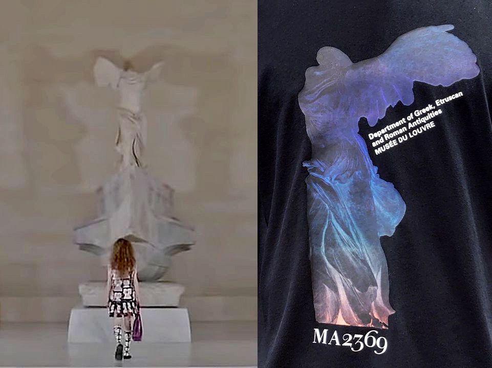 Left: Louis Vuitton show that ended with the last model in front of the statue. Screen grab: Louis Vuitton. Right: The image on a Uniqlo T-shirt. Photo: Zhao Xiangji