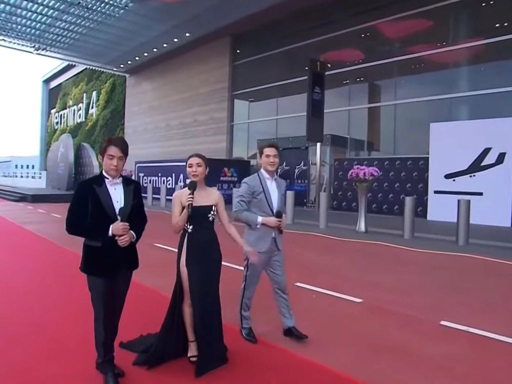 Then there was the red carpet—not one but two! First encounter was a stretch on the driveway of the entrance to the departure hall and another, ridiculous as it was, on the airport apron, with SIA aircraft as backdrop. Not everyone got to walk in the front and the rear. You needed be a top star to be granted both. Or not either (Fann Wong and Jeanette Aw! Why were they exceptional, I wondered). All of them (those who mattered, anyway) did arrive on the driveway (which I only now realised is red asphalt—already a red ‘carpet’), but some did not alight kerbside. Zoe Tay suddenly appeared, with the top end of the red carpet behind her, with no car in sight, and with no companion. Did she take a bus? I hope not. Wearing a strapless, massive bow-front Caroline Herrera gown with a train, she gamely walked a considerable distance to the first of two platforms to be interviewed. No one was on hand to be chivalrous and to help her up the three-step platform, not even those around to open car doors for other stars. Her steady climb prompted host Lee Teng to say that Ah Jie “真的很有风范,完全是国际巨星的范儿—really has an air of stylishness, and it’s totally in the style of international superstars.”