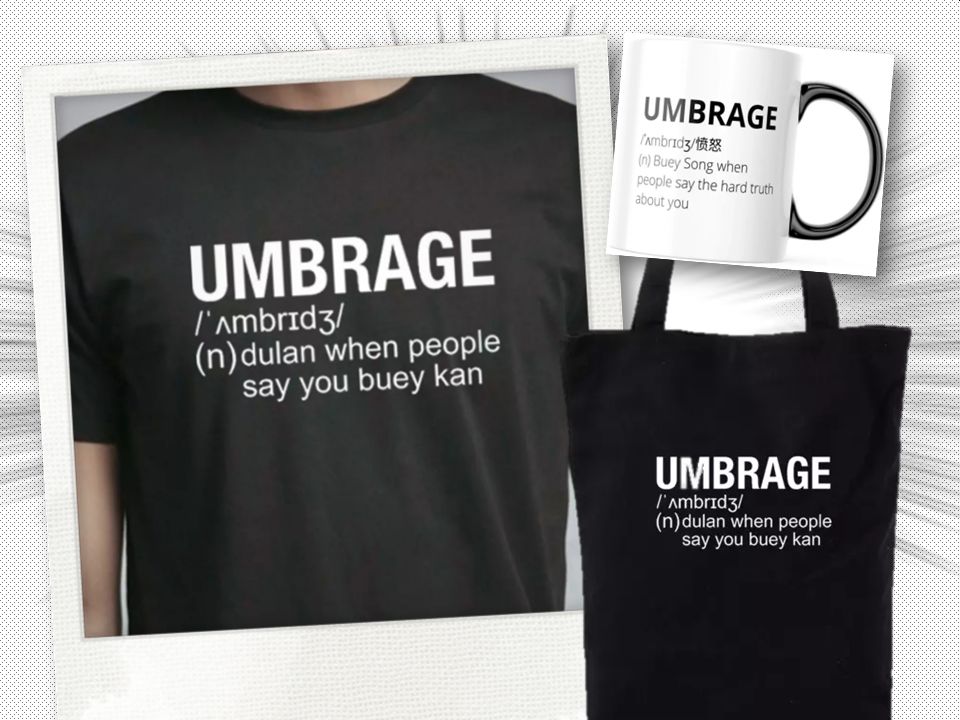 It is rather puzzling that the lead time for producing garments, bags, and cups could be this short. Clicking on a Lazada ad on my social media site, I was brought to a page of a selection of merchandise—six different pieces in all. There is a three-product ‘line’ known as “Umbrage Dictionary”, offered by sellers that appear to be in the digital printing business. Things the now-shuttered-for-good Naiise would have gladly taken in. When I looked closely at the images on the website, I could see that the U-word had been superimposed on the images of standard-issue crew-neck tees. This is likely a print-on-order product line, which could explain how they managed to put umbrage out almost as soon as Ng Yat Chung was susceptible enough take it. But I wonder if more umbrage would be taken if he has read how the seller’s lexicographer defined the word that had a nation talking and dissing.
