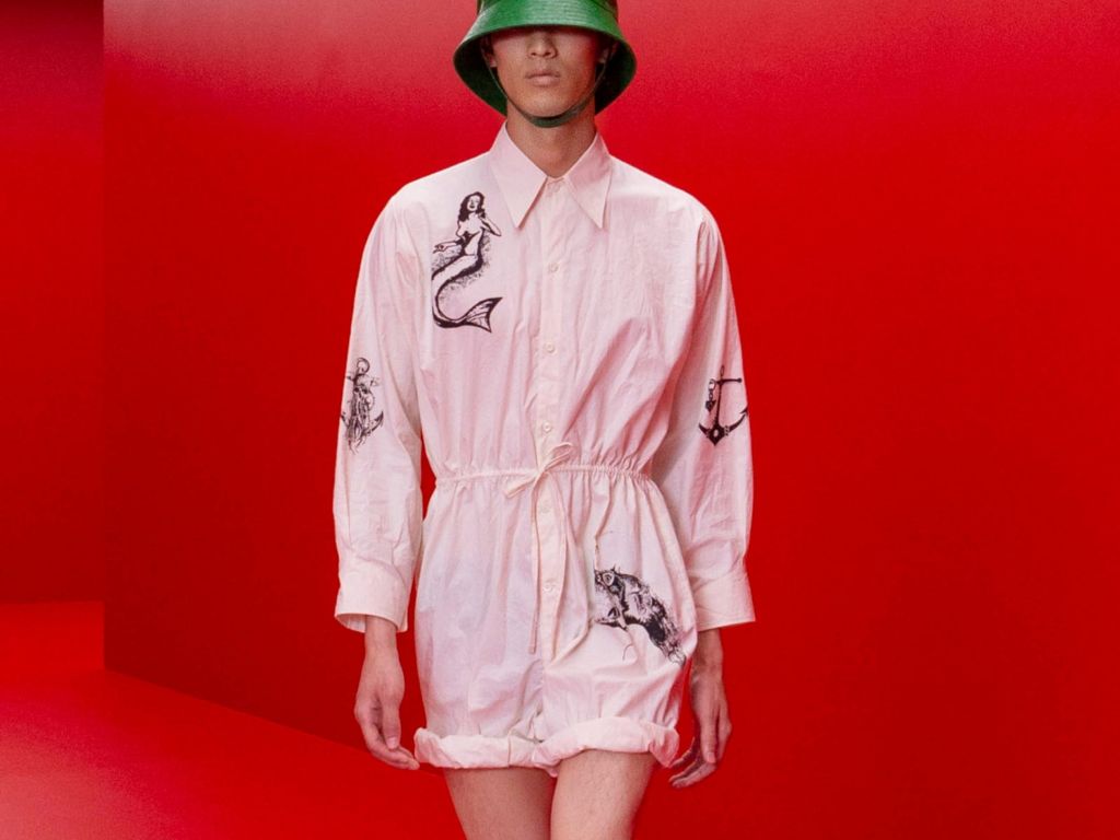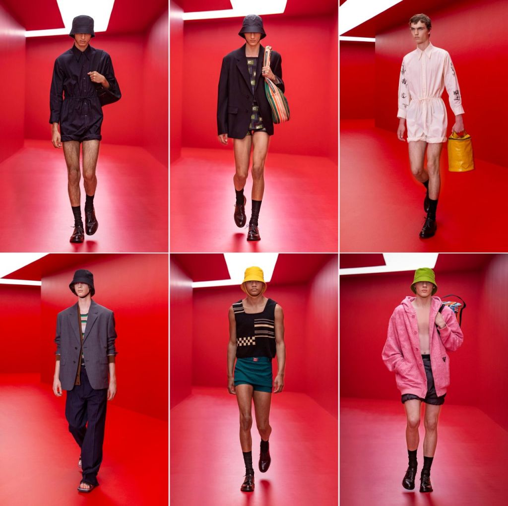 And what do you wear to meet joy? First up, rompers, one of the key products in the likes of The Editor’s Market. For men, Miuccia Prada and Raf Simons bring together shirts and shorts as onesies (top pic), all in what appears to be the shirting fabric of cotton poplin. To be sure, these are not shortened jumpsuits. They have the ease and playfulness of rompers—garments initially associated with children’s clothes. Ensuring that their leisure intention isn’t mistaken, prints are incorporated: ’50s-looking tattoo-illustrations spread randomly across. If you want something more traditionally masculine, there are a couple with bold, vertical, unbalanced stripes. Next, there are the abbreviated ‘skorts’—skirt-meets-shorts combo—that, for any wearer, are half way to donning an actual skirt. But it isn’t immediately clear, while we watched the show on our PC, if what is shown is a skirt over shorts or that the front panel hangs like an apron. Either way, the skirt component isn’t ambiguous.