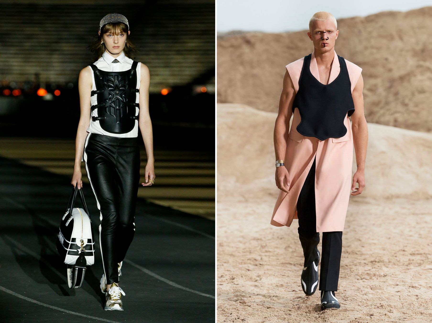 It’s rather curious to us that warm-weather (or cruise) dressing would require additional gear to trap air to the torso, while arms are totally uncovered. Isn’t it true that with the heat (year after year not letting up), many prefer not to layer? So the suddenly popularity of the breastplate is rather curious. Okay, so far it’s just from two labels: first Dior for cruise 2022 and Burberry for spring/summer 2022, but would these armour-like extras be prelude to a wider trend? Sure, these are not really an outer layer. Do you even consider them clothes? Surely not accessories! But since they are worn and would likely remain on the body throughout the duration of their stay (unlike a bag, which are frequently parted with the body), they might be considered garments?