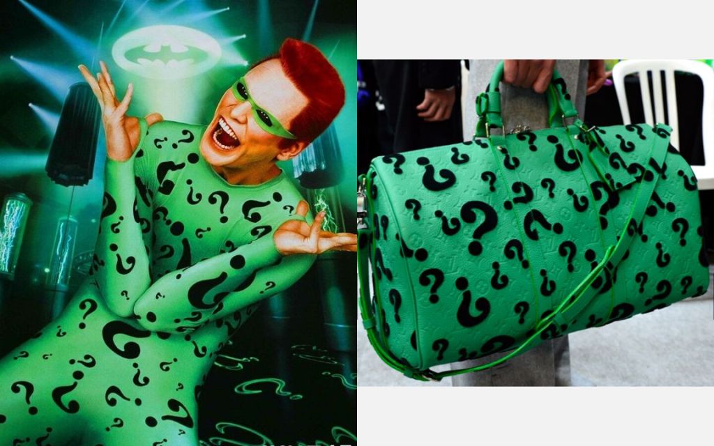 in 1995’s Batman Forever, the Riddler, played by the inimitable Jim Carrey, wore what was then described as a return to the “original costume”. It was a leotard that Mr Carrey was surprisingly able to pull off well. Costume designers Ingrid Ferrin and Bob Ringwood gave the union suit a rather youthful fit (no doubt still tight), with more question marks, placed in graphically fetching randomness. Mr Carrey’s the Riddler had other costumes too, mainly a jacket (not blazer) in the style of the Stalin tunic (some might think it looks like a Mao suit!) that was also green and floridly logo-ed, but it was the leotard that most movie-goers remember. And it is this outfit that seems to be the inspiration behind the Louis Vuitton bag.