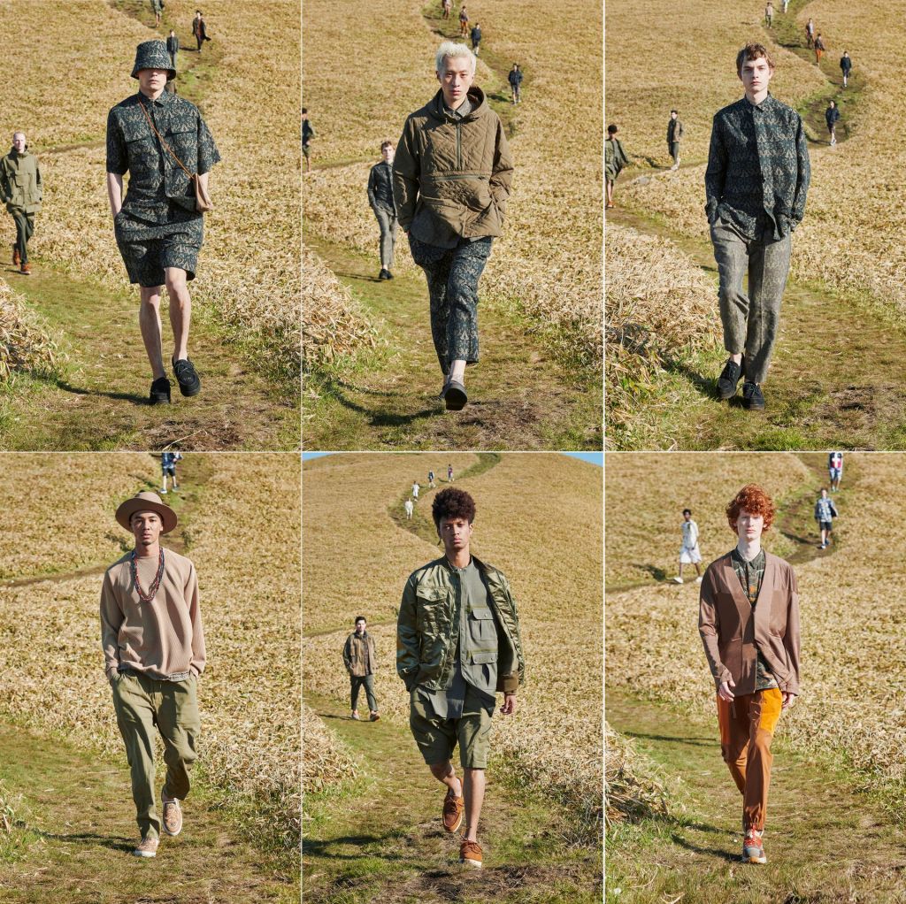 In Japan, there are spectacular open outdoor spaces to go to unwind and escape. And they are beautiful, immense and beckoning, too. Just any view, any angle of majestic Mount Fuji will leave you in no doubt the extent of nature’s striking gifts for the island-country. And for all seasons too (the colours!). Unsurprising, therefore, that the Japanese love exploring their stunning outdoors. White Mountaineering too—it is against a verdant hillside (and soundtrack by the uplifting electronic sounds of Yehezkel Raz and Jameson Nathan Jones) that the Japanese label presents their spring/summer 2022 collection, perhaps giving the brand the visual context it has never really needed. O’er vales and hills, to quote Williams Wordsworth, the models (a cast of just 18) walk down meandering tracks and on wooden footpaths over bubbling brooks. This is one of the most refreshing collections of Paris Fashion Week. Nothing arid! There is no desperate hope that after the pandemic eases, we will party like there’s no tomorrow. White Mountaineering has more pastoral pursuits.