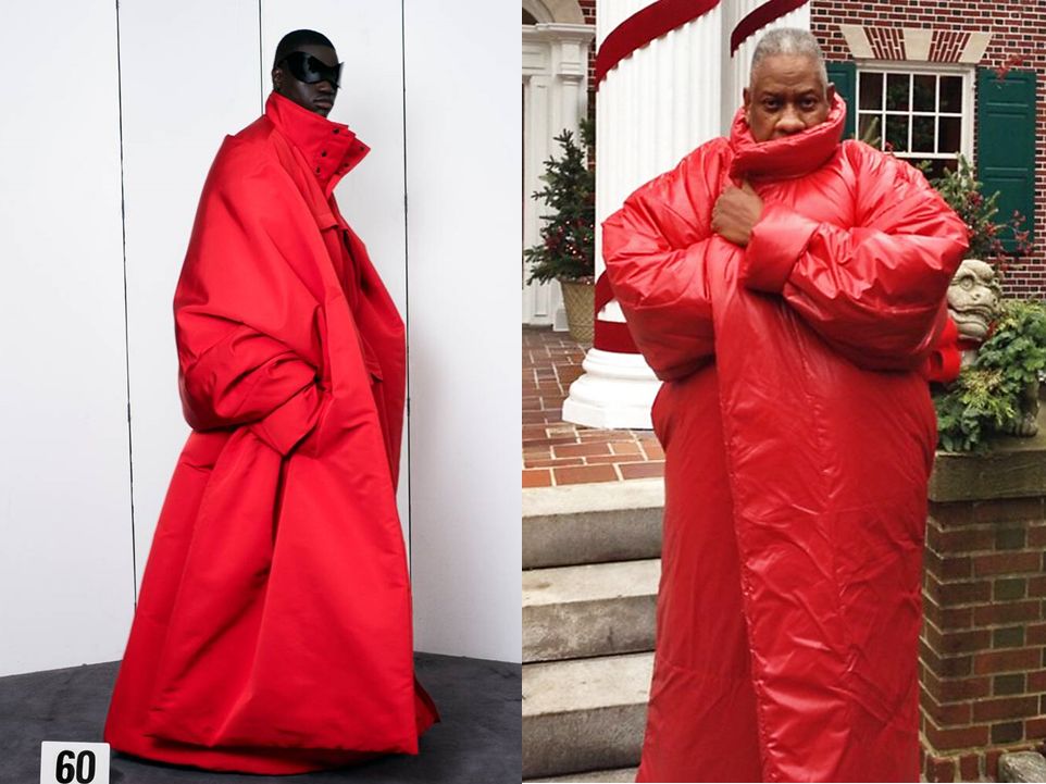 Balenciaga isn’t quite the first to design it. But perhaps that does not matter as much as who wore it first. Andre Leon Talley, the connoisseur of the caftan, loves a large, floor-length coat too. Back in 2015, Mr Talley posted on Instagram a selfie and an OOTD that featured a long, ripe-red Norma Kamali puffer that is popularly known as the “sleeping bag coat” (Ms Kamali reportedly conceived it in the mid-’70s). He added the puffery “Luxe! Total Luxe” to the comments too. Apart from that, he would post photos of the coat another six more times—on IG alone. The tubular covering seemed to be his go-to outerwear for that season. He was photographed in front of his White Plains house wearing the said coat and, urghs, UGGs as the face of the American-own, born-in-Australia footwear brand. That photo was used countless times, other than for marketing communication purposes, even as illustration to articles that reported on his real-estate woes of early this year. And he appeared in the same glorious redness in the 2017 biographical movie, The Gospel According to Andre. The colour of chilli seems to be his favourite for outers in recent years: preceding the Kamali coat was an equally scarlet, just as omnipresent Tom Ford “kimono”.
