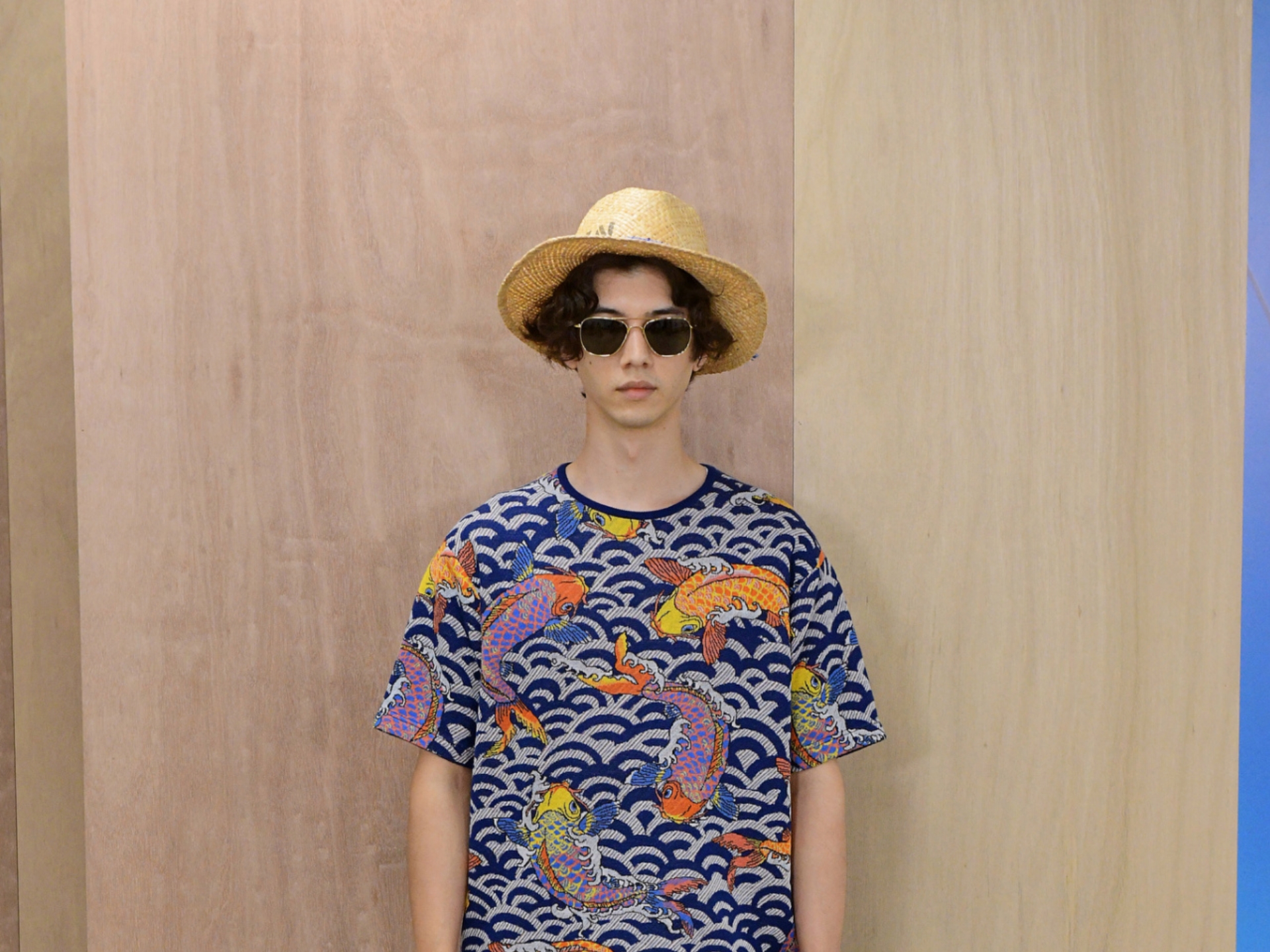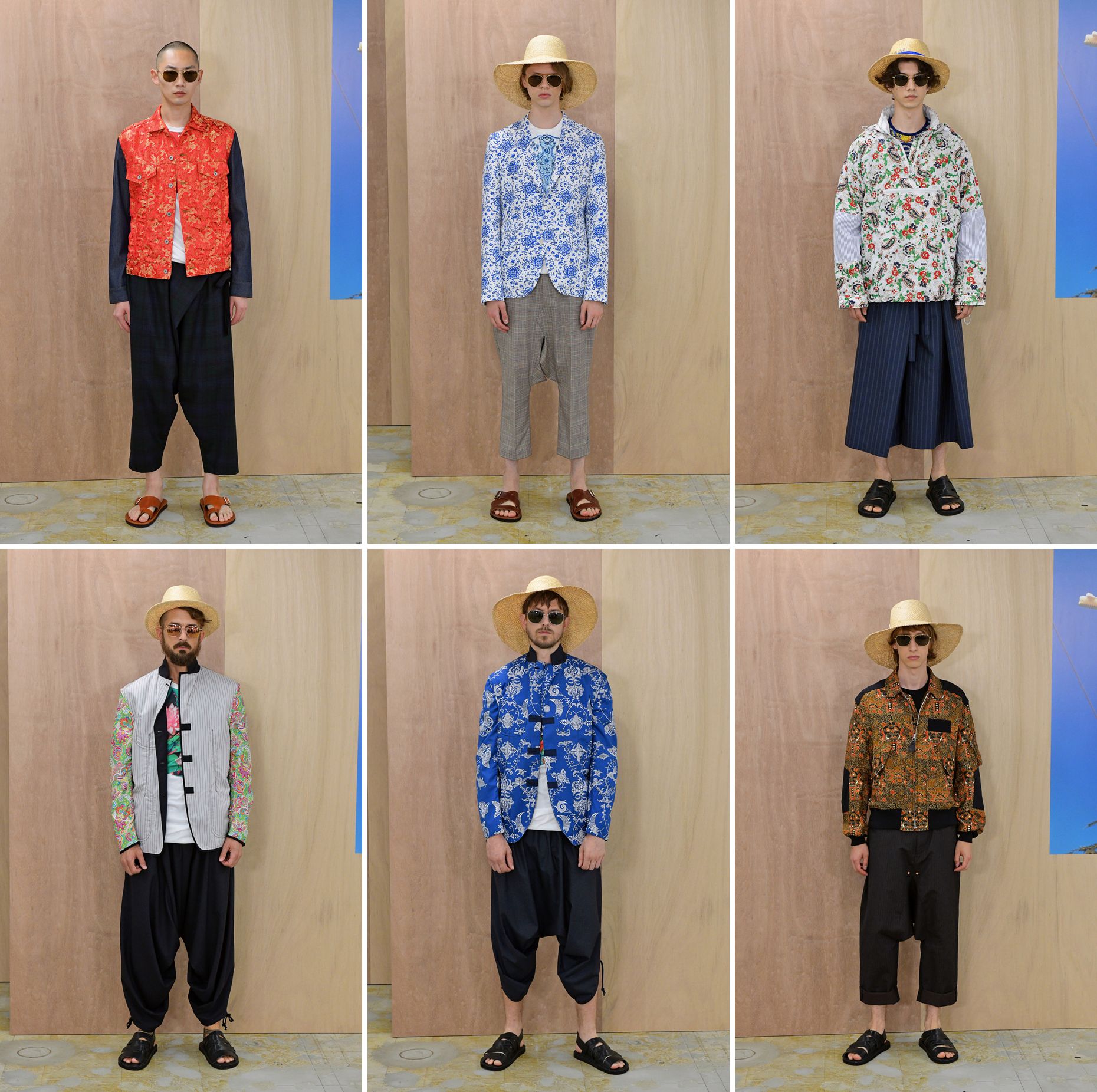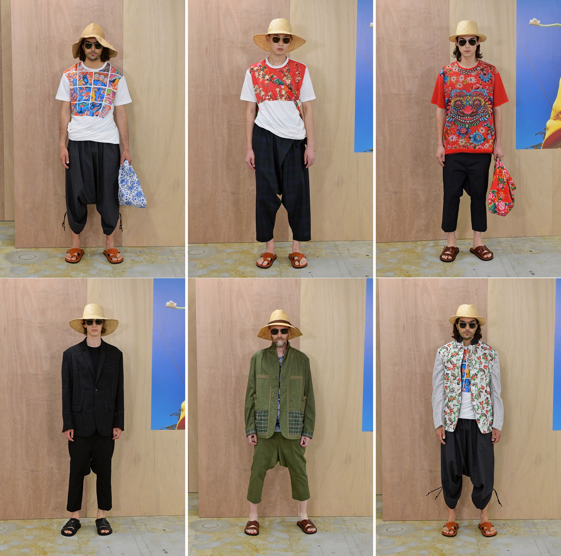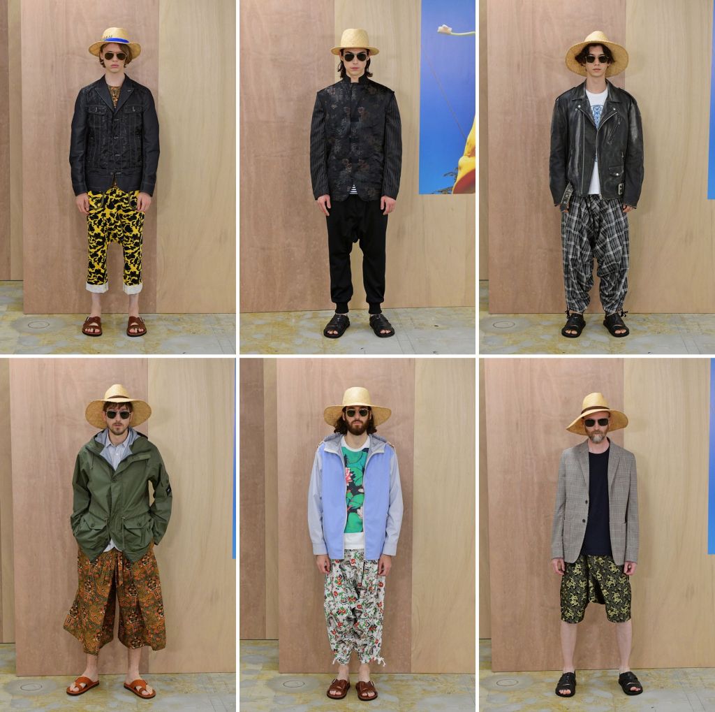 Mr Watanabe’s work this season riffs on Asian motifs, prints, and details, which he has intermittently done in the past. More pronounced now are his use of visuals by Asian illustrators: Chinese illustrator/artist, Shenzhen-based Rlon Wang; Japan’s pop art fave Keiichi Tanaami, Nepalese artist/Californian resident Ang Tsherin Sherpa, Thailand’s fashion darling Phannapast Taychamaythakool, and Vietnamese children’s book illustrators Phung Nguyen Quang and Huynh Kim Lien. But rather than just use them as patterns on fabrics, he has employed them as he would with parts of his favourite garments. The prints are used on yokes—like bibs, some are in grid form, some as repeated patterns, some as a single delineation of, say, a head. There are prints used as linings of jackets too. A surprising large number of T-shirts with those artists’ illustrations are shown. In fact, this seems to be the summeriest collection of the menswear season, even when there considerable outers too.