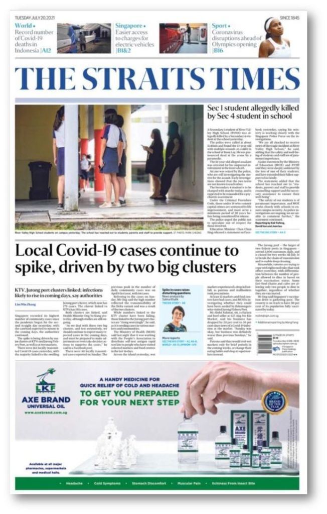 These are difficult and sensitive times. The two stories on the front page of today’s issue of The Straits Times (both print and digital) tell us that. But the appearance of the sole, quarter-page advertisement that runs beneath the cover stories is the proverbial rubbing the wound with salt. “Sec 1 student allegedly killed by Sec 4 student in school” and “local Covid-19 cases continue to spike…” are not exactly alerting readers to the bright spots in an increasingly distressing pandemic year. Sure, the Axe Brand Universal Oil (斧標驱风油) ad has nothing to do with the editorials above it, but even without reading the story related to the murdered student of the first report, many of us knew by yesterday afternoon, despite the authorities urging us “not to speculate”, that “an axe was seized by the police” in relation to the school homicide. How is it possible that no one in ST saw how crassly at odds the editorial and the advertisement are? Or, discerned I.N.S.E.N.S.I.T.I.V.E spelled across the page?