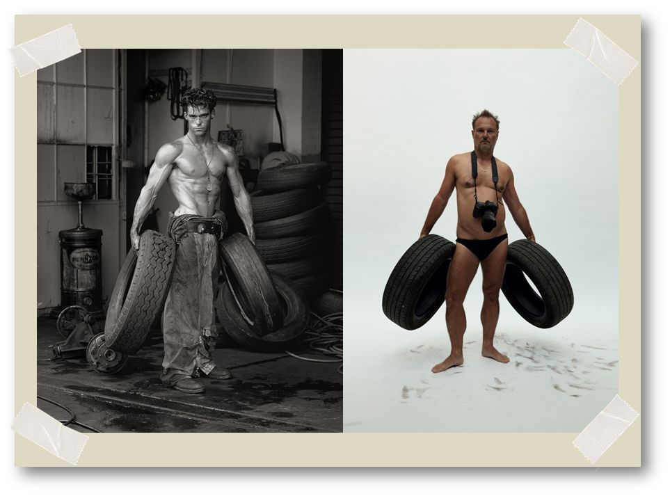 But what struck us immediately as familiar is the pose and the prop. Back in 1984, a photo of a muscular guy similarly holding tires (but with more clothes on) appeared in the Italian magazine Per Lui. It was shot by the American photographer Herb Ritts, and is often considered one of the great images of the 20th century that changed fashion photography forever. The monochromatic photo would come to be known as Fred with Tires. According to Mr Ritts, the commissioning editor Franca Sozzani (when she was with Lei and brother title Per Lui, before heading Vogue Italia) had sent some “hideous rain coats” for the shoot. He “hated” them. With the British stylist Michael Roberts (also photographer and illustrator), they picked jeans and overalls as replacement. The model who posed in full muscular glory was a UCLA undergrad, named Fred Harding. Not much is known about the guy or what happened to him after that.