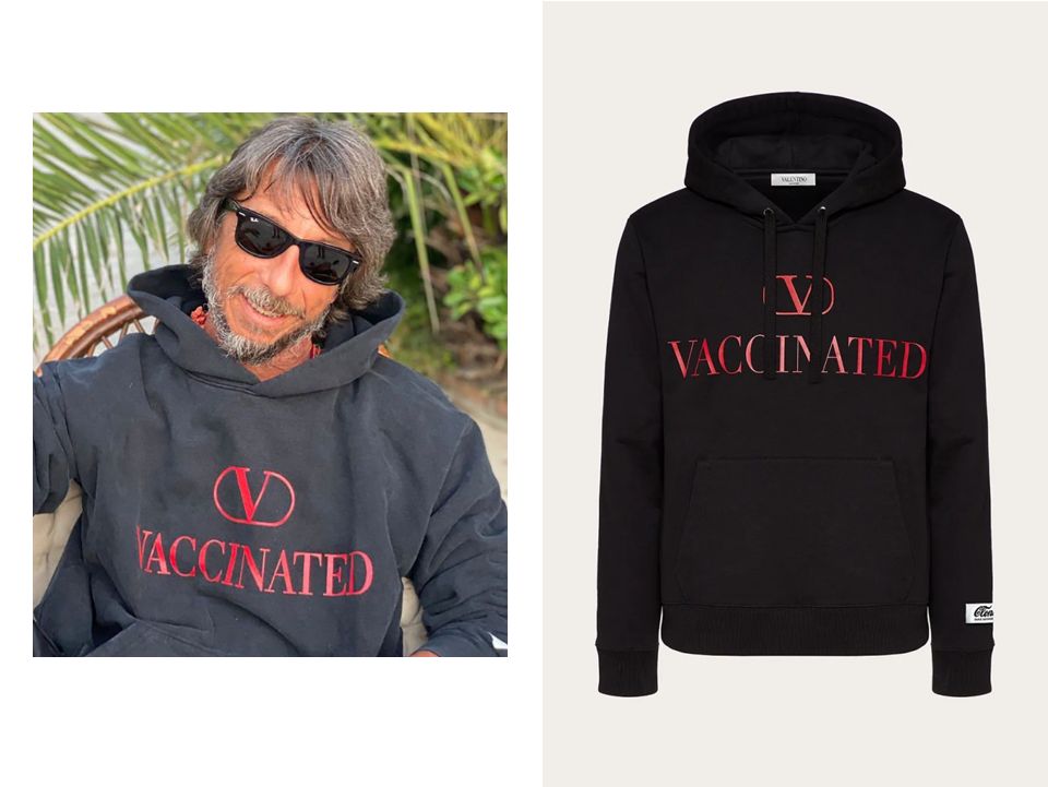 But, apparently, Valentino only told part of the story. According to media reports, Cloney “cloned” Valentino in their hoodies by replacing the V in ‘Vaccinated’ with Valentino’s V and the rest of the letters in the brand’s serif font. Mr Piccioli spotted the item on IG and magnanimously bought them to gift his friends, seeing the potential good that could come out of this hoodie. So rather than sue Cloney, as big brands such as Adidas are wont and eager to, he chose to work with them, pairing the couture brand in his charge with another closer to street that stars such as Justin Beiber and wife Hailey already love so that both can benefit from the resultant social-media exposure and old media support.