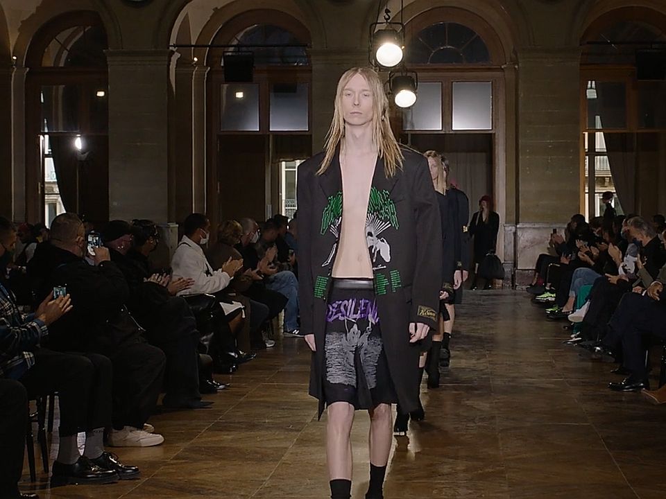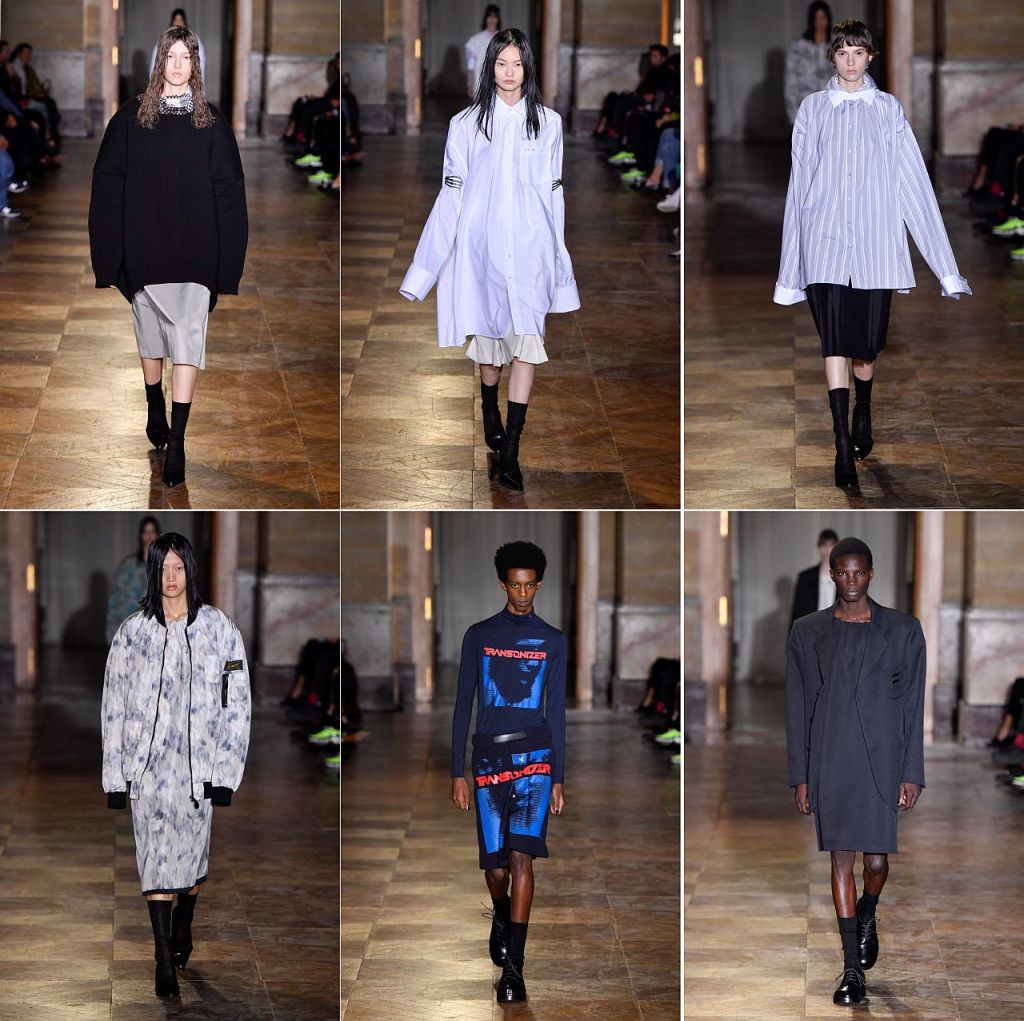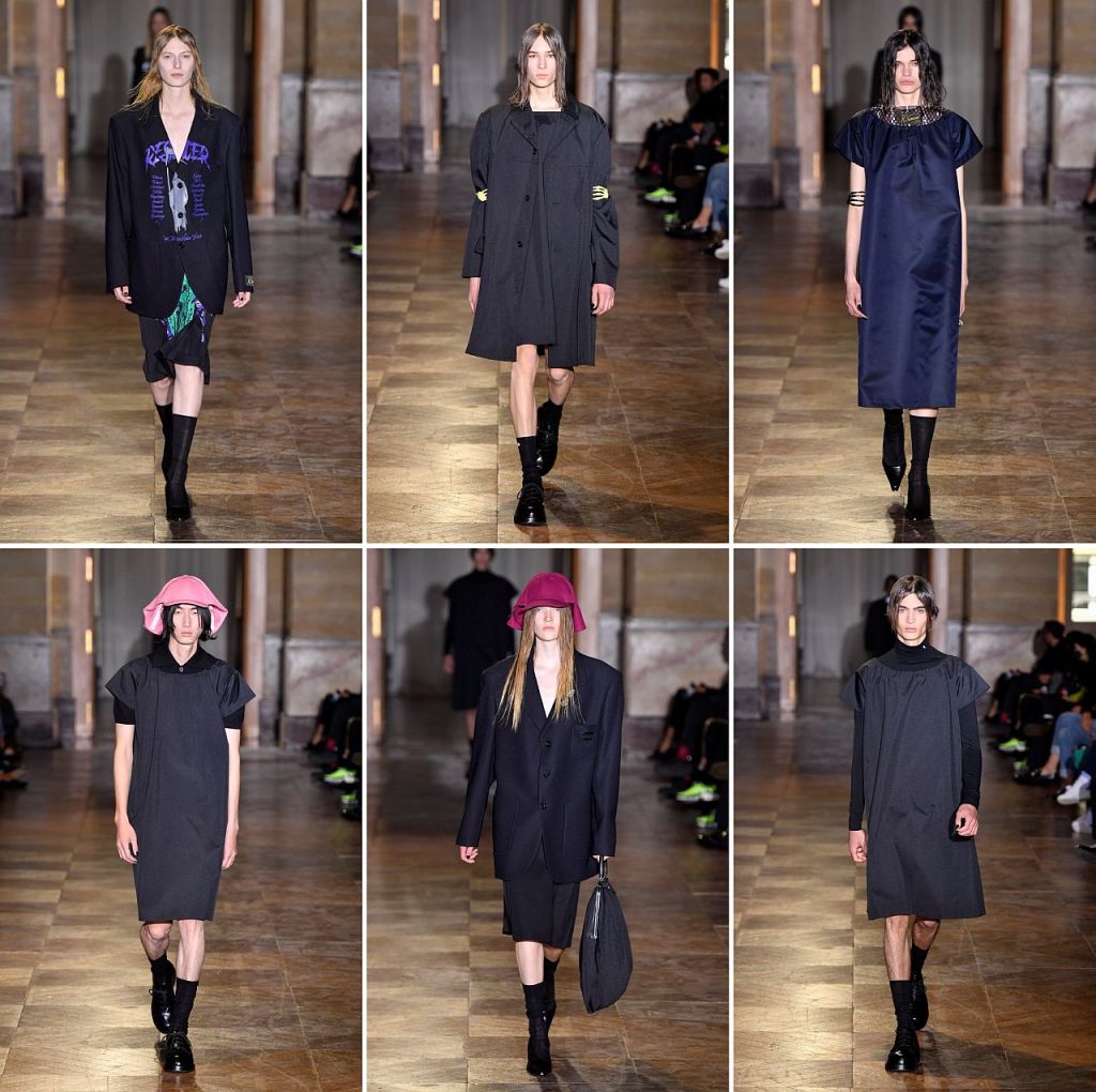 The first thing that catches our attention are the shorts. Or what we think are shorts, but they turn out to be quite different: they are not divide into legs. So these are skirts? Of course, it is increasingly apparently that men are welcoming non-bifurcated bottom and the like into their wardrobes, and Raf Simons seem to be catering to these guys (and those gals for whom pants are as dispensable). In fact, there are no trousers in the co-ed collection (or maybe there is just one?). Both men and women are attired to show off legs—if not entire limbs, definitely calves. Mr Simons, we do not think, is trying to feminise his menswear offering. They still look masculine, even when many of the pieces are mostly associated with womenswear. Yet these are clearly conceived and sized for a masculine body, not necessarily brawn. In fact, is doubtful a muscular fellow would look good in these somewhat vertically-linear clothes.