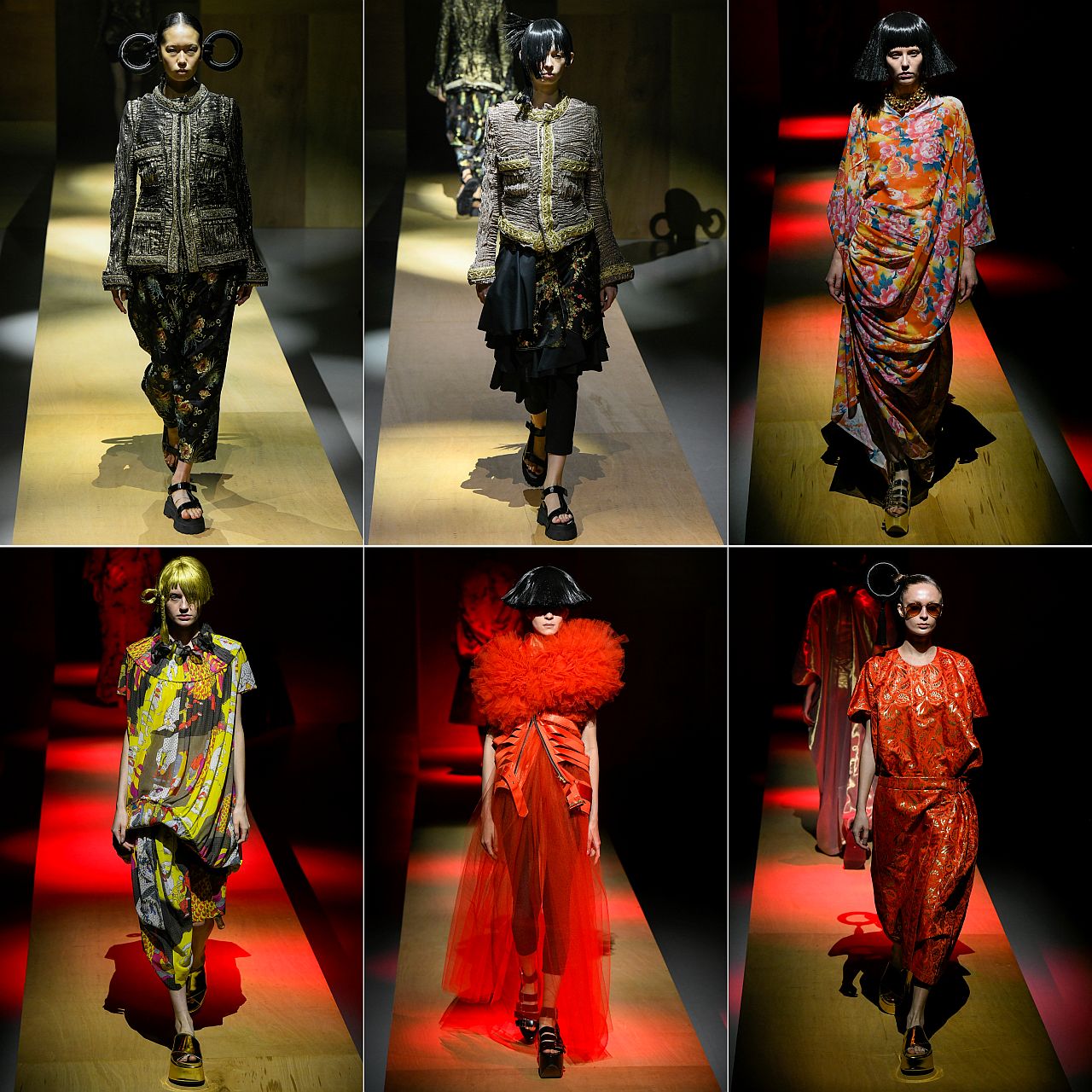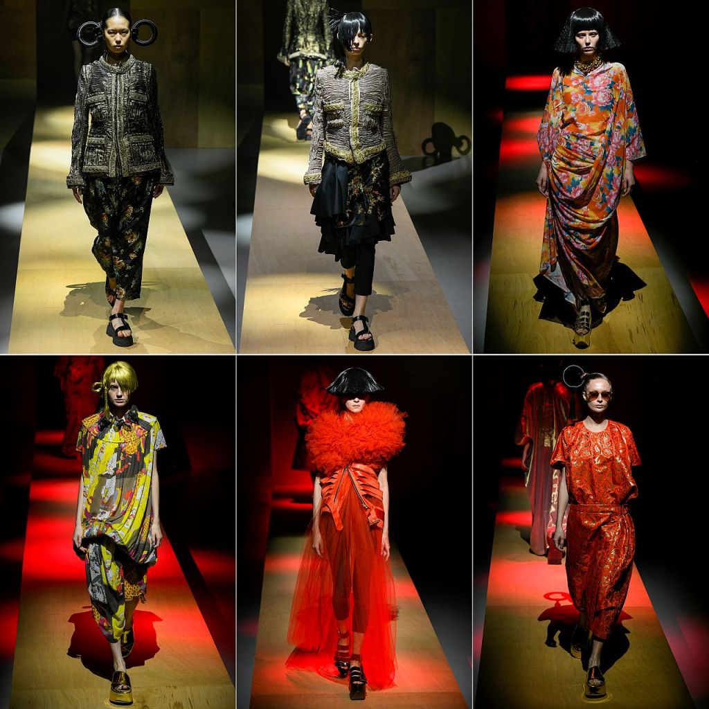 But that is not to say that Mr Watanabe does not exoticise the looks at all. In fact, the styling seems to cater to a more Western perception of what is Eastern exotica. The hooped hair on the sides of the head, for example, is evocative of the pierced and stretched ears of the women of the Karen ethnic group of the Myanmar-Thailand border. Peculiarly Asian, too, are the wigs in the shape of the Vietnamese non la rice hats (or 斗笠, dou li in China) and the unadorned liangbatou (两把头) headdresses of Qing Chinese women that could be homage to the Story of Yanxi Palace (延禧攻略). Even the platform sandals have a whiff of the cunzi shoes (寸子鞋) of the ancient Manchus, in particular those with 元宝底 (yuanbaodi or ingot bottom) soles. Perhaps these are to augment the Asianness of the clothes, which are, in themselves, less derivative, and more in tandem with Mr Watanabe’s penchant for montaging shapes, patterns, and textures.