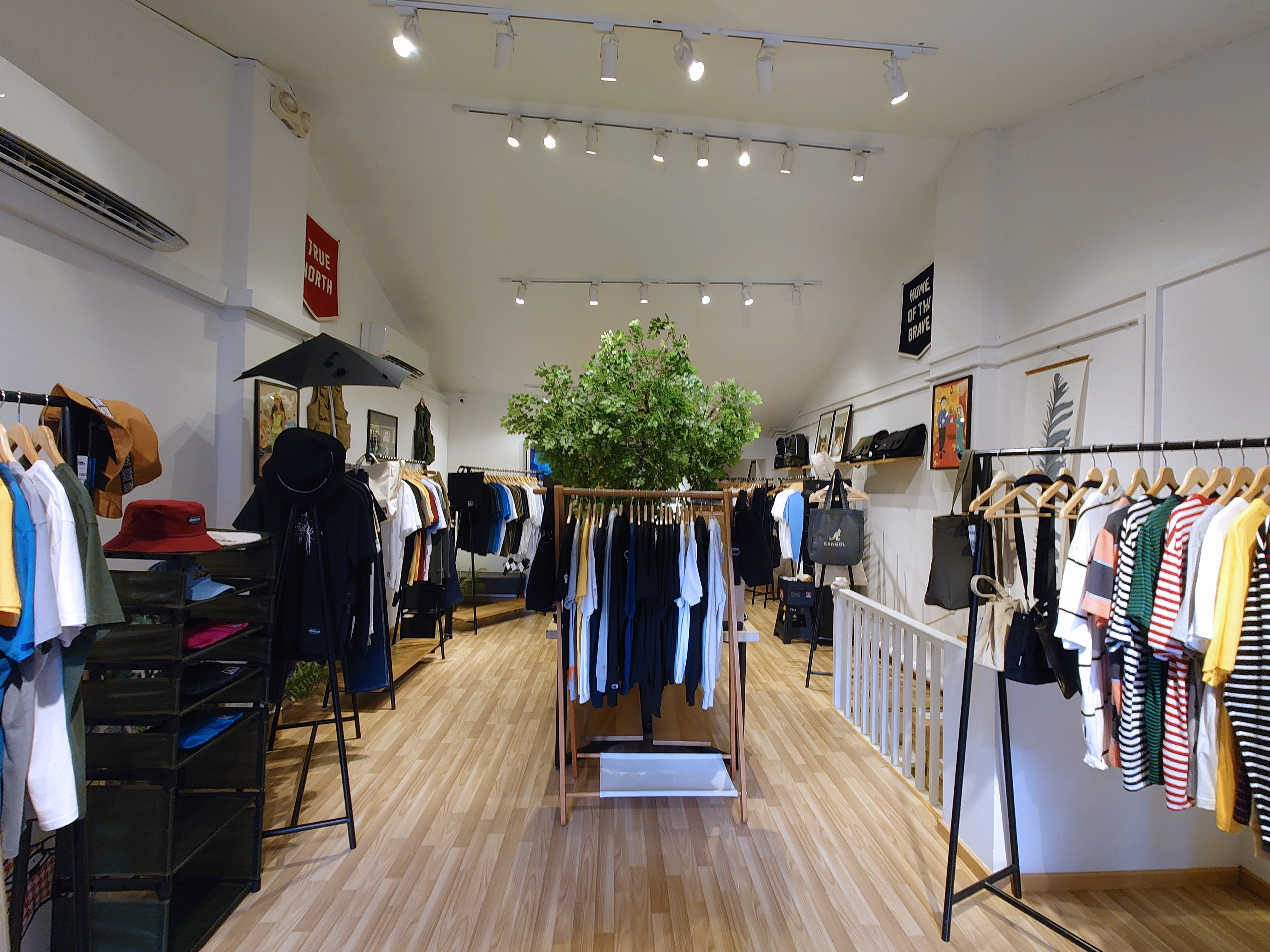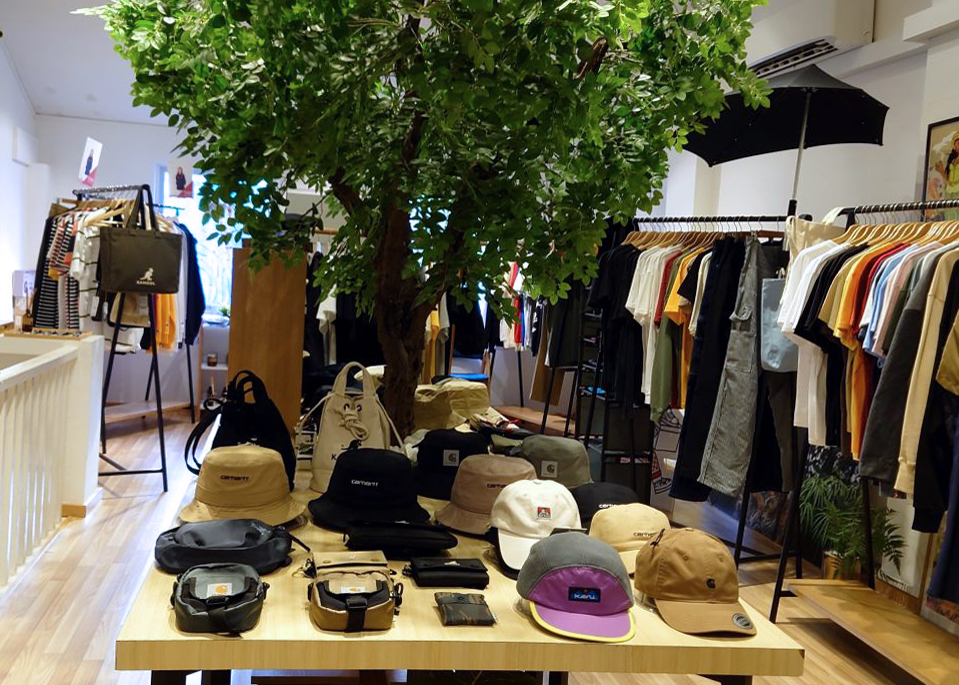 Going through the stuff after you enter will take you some time. And then you remember that there’s upstairs. (The staff will happily remind you too.) So up you go. As the view of the second floor unfolds, the Japanese vibe again hits you. Up here, there is a faux tree in the middle of the space, a shade provider that seems to bring the disparate brands together, like a group of well-togged friends convening at their favourite spot. On the weekday afternoon we were there, we heard giggling behind a curtain. As it turned out, some girls were trying on the Ben Davis. Although GLB stocks mostly menswear, it also attracts women with a weakness for jendaresu-kei (genderless style) or too-big T-shirts, sometimes inexplicably massive. In fact, most of their social media posts are photos of girls dressed in tees and bifurcated bottoms. One of them in the fitting room emerged to have a better look at the mirror. She could have just leapt out of Goodluck Bunch’s Instagram grid.