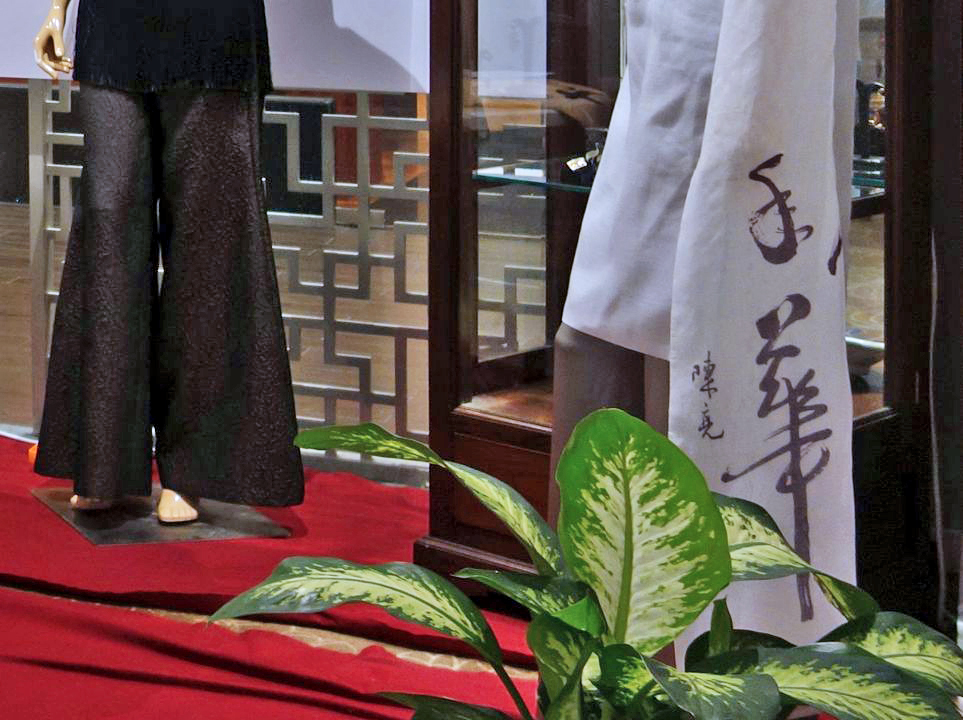 What, to us, did not work was the seemingly obligatory inclusion of Grace Chen’s calligraphy. The cursive writing appeared on two garments: on the skirt of a tunic and on one extra-long fluted sleeve. Ms Chen, the first to come onboard on this project, initially named ‘Po’ject 苏, is a masterful calligrapher of bold, assertive, and confident strokes that Wang Yanqing described as “masculine”. But it does not appear that her ink compositions were conceived to be applied within the very specific shapes of Mr Wee’s garments: she did not have fashion in mind. They looked to have decamped unceremoniously from paper to cloth, and unable to escape the kitsch that are easily found in any gift shop in the first-tier cities of China. But Mr Wee begged to differ, explaining that he had, in fact, picked the calligraphy himself, after asking Ms Chen to read what she had written to him and explain their meaning. It was at this point that the designer made known to us that he does not read or write Mandarin, although he speaks it proficiently. “I don’t read and write putonghua (普通话),” he said. “In a 10-word sentence, I can recognise only three”. Startled, we asked what second language he studied in school. “Malay” was his rapid reply.