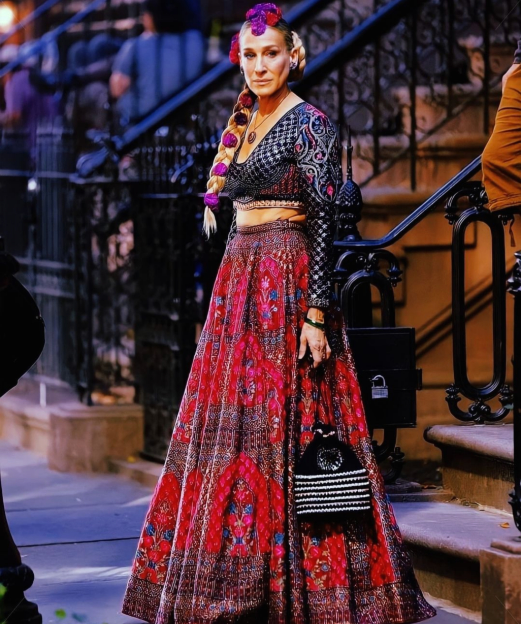 And then Ms Bradshaw is, 21 minutes (and a consultation with a facelift doctor) later, all dressed and ready to go celebrate Diwali somewhere in Queens. She emerges from her part-time home, a Brownstown on the Upper East Side, decked out in a long-sleeved choli and a full-skirted lehenga! Did Ms Patel not say, in “my Soho” that her friend should get a sari? Or were we mistaken (could not be bothered to rewind)? As she arranges her outfit outside the front door to her block, it is clear Ms Bradshaw is not wearing a sari, but a skirt, the lehenga, usually ankle-length—hers seems to be sweeping the floor. It is hard to imagine that fashion-mad Carrie Bradshaw did not know what she was wearing, exactly.