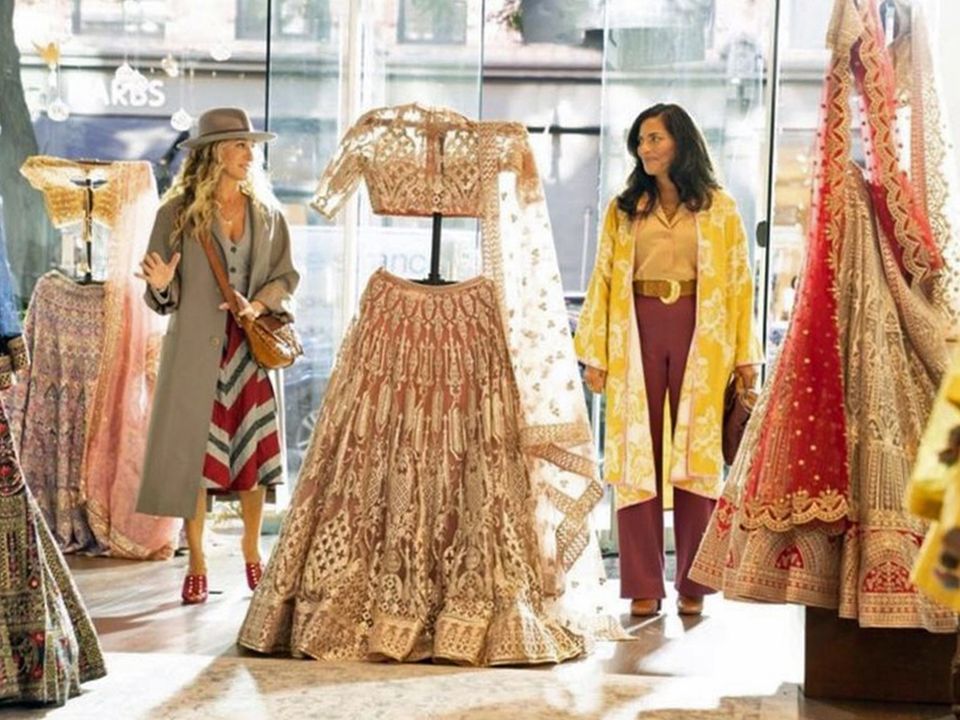And Just Like That… it’s Diwali. Carrie Bradshaw has a new gal-pal, her real estate agent Seema Patel (played by British actress Sarita Choudhury). Not only has Ms Bradshaw bought an apartment from the latter, she is getting rather close to her. And Just Like That… Ms Bradshaw is going to celebrate the Festival of Light with an Indian family in episode six of AJLT, titled—what else?—‘Diwali’. But before that, soul mate Seema took her to “my Soho” in Manhattan for sari-shopping. In the unnamed store, no sari was seen (we certainly did not see one), but Ms Patel said “sari” twice: “I’ll buy a stunning sari” and “let’s get you a sari”. Neither woman touched a sari; neither is shown leaving the store with a purchase of one.