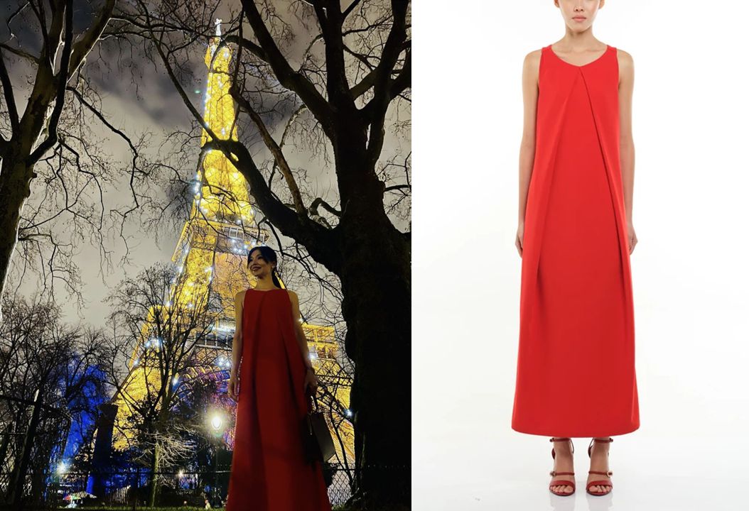 In her latest post on her healthily-followed Instagram (134K), liked by fellow Singaporean-in-Paris, designer Andrew Gn, the still-tethered-to-Mediacorp personality shared an ill-lit photo of her with the Tour Eiffel behind her, in an Akinn X Sharon Au dress called ‘Red Carpet’, presumably named after something she or her former MediaCorp colleagues might wear to the Star Awards (红星大奖). An ankle-length, loose-fit sleeveless dress, with an inverted pleat placed in the middle of the scoop neckline, the ‘Red Carpet’ is of a silhouette, we should say, that’s familiar: body-skimming, but still roomy enough to accommodate assorted bodily girths without risking the misfortune of looking like a downright sack. Ms Au wrote in the comments of that post—somewhat gleefully, “…you can eat as much bak kwas as you want wearing this. No matter what body shape you are, you can rock the Red Carpet”.