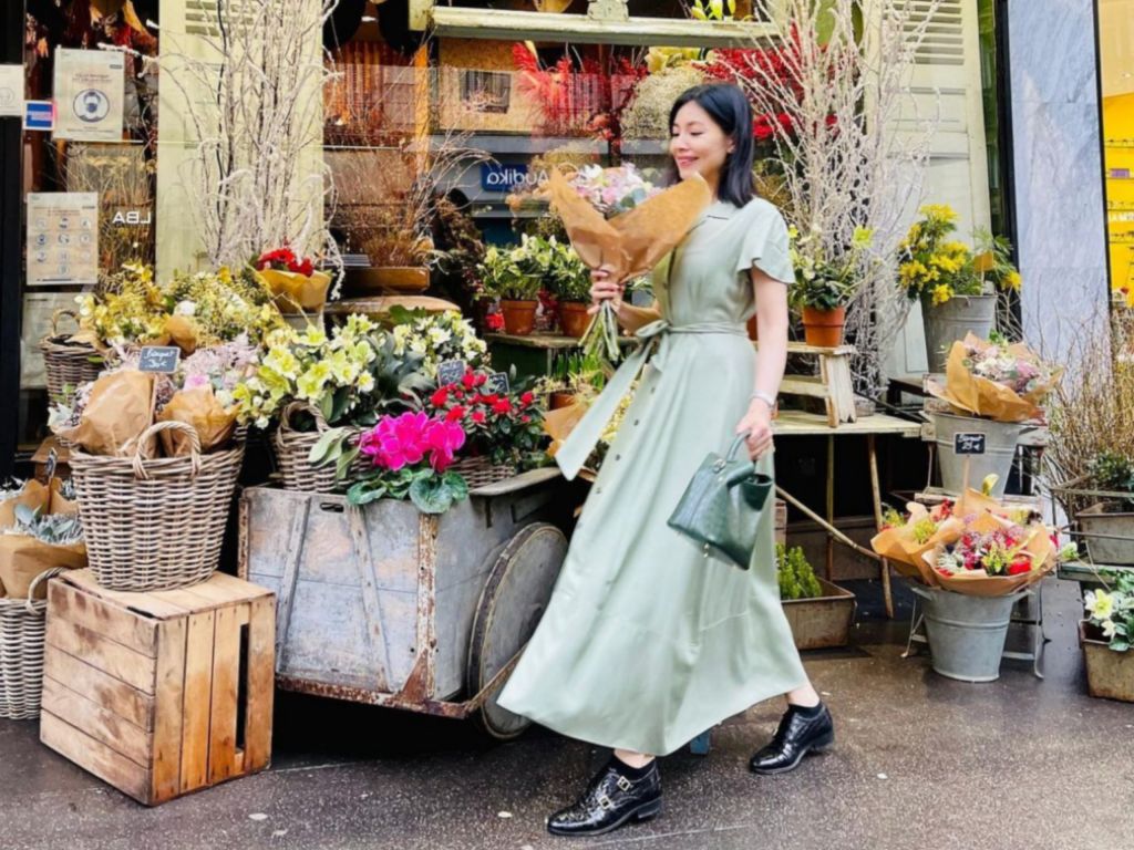 Sharon Au prancing the streets of Paris in an Akinn X Sharon Au ‘A Fresh Start’ dress. Photo: sharonau13/Instagram