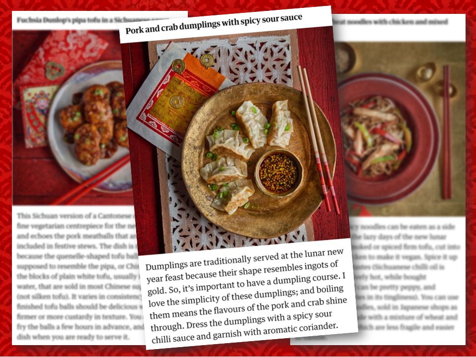 There is something disconcertingly simplistic here too: As dumplings (饺子, jiaozi) “are traditionally served at the lunar new year feast”, The Guardian declared, they have to be styled with some assurance to the angmo creatives—something “traditional”. (Mostly northern Chinese eat jiaozi for the first meal of the Lunar New Year.) For many stylists in the West tasked to put together an image related to Chinese culture, anything that comes with Han characters (sometimes even Japanese text will do) or are at variance with their own aesthetical familiarity can pass of as inspired by China. It did not help that The Guadian’s dumplings could be gyozas and the BBC’s “lo mein” could be mee goong haeng (Thai dry noodles with prawns). Nothing about the two dishes say 中国菜 (Chinese food), so they need obvious visual cues, even extraneous ones.