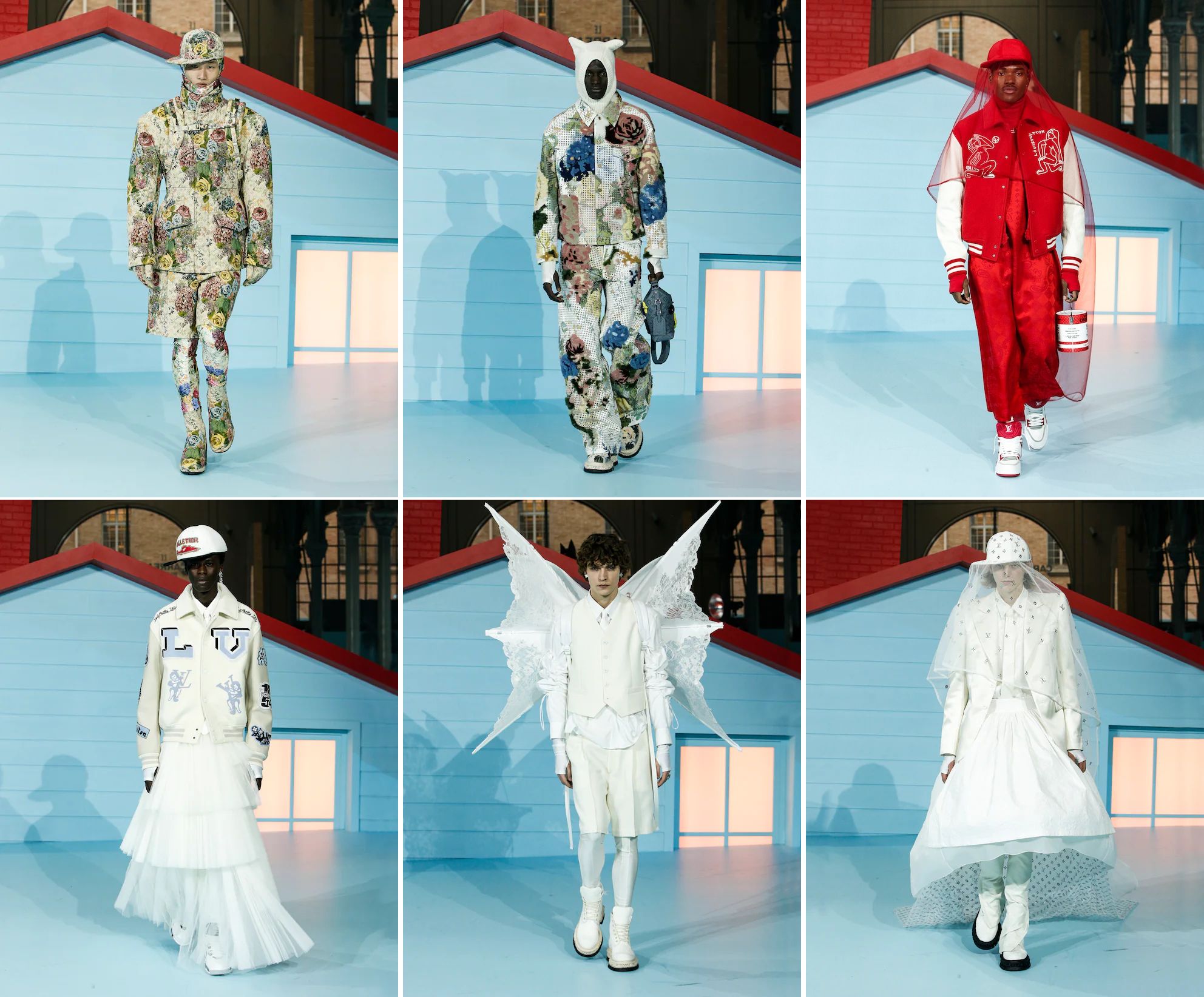 A Louis Vuitton collection for men these days is incomplete without skirts. So there they are in various forms, including the asymmetric piece worn with what appears to be a football jersey (manlier?) and the sheer ones that would delight Maria Grazia Chiuri. The sports clothes, too, are still present, such as the varsity jacket that now comes with a cutaway collar. If a man has a weakness for openwork fabrics, but does not desire lace, there is the pantsuit with the overlay netting linked with LV floral motifs (as seen in their house monogram). This is not gender-bending; this is exclusive inclusivity that gives the LV shopper options. If you are planning to be a he-bride, there is something for you too, complete with trailing veil. And if it is an angel that you wish to dress as—an LV Angel, no less—there are assorted wings for you to choose. How pleased Virgil Abloh must be, looking at all this—and at all of us—from up where he is now.
