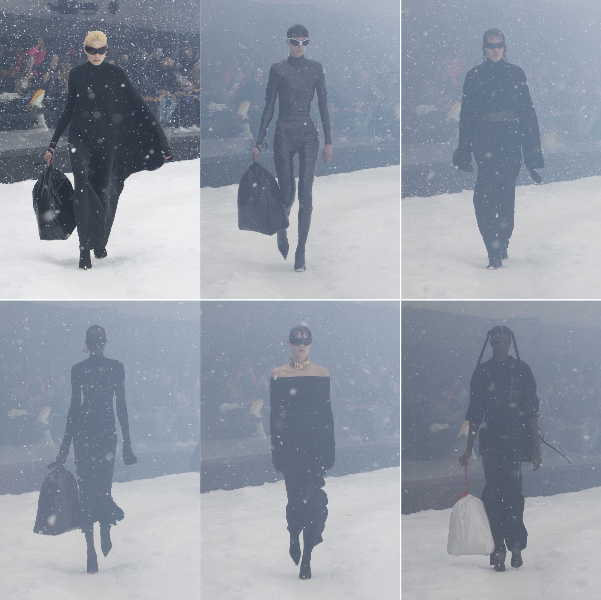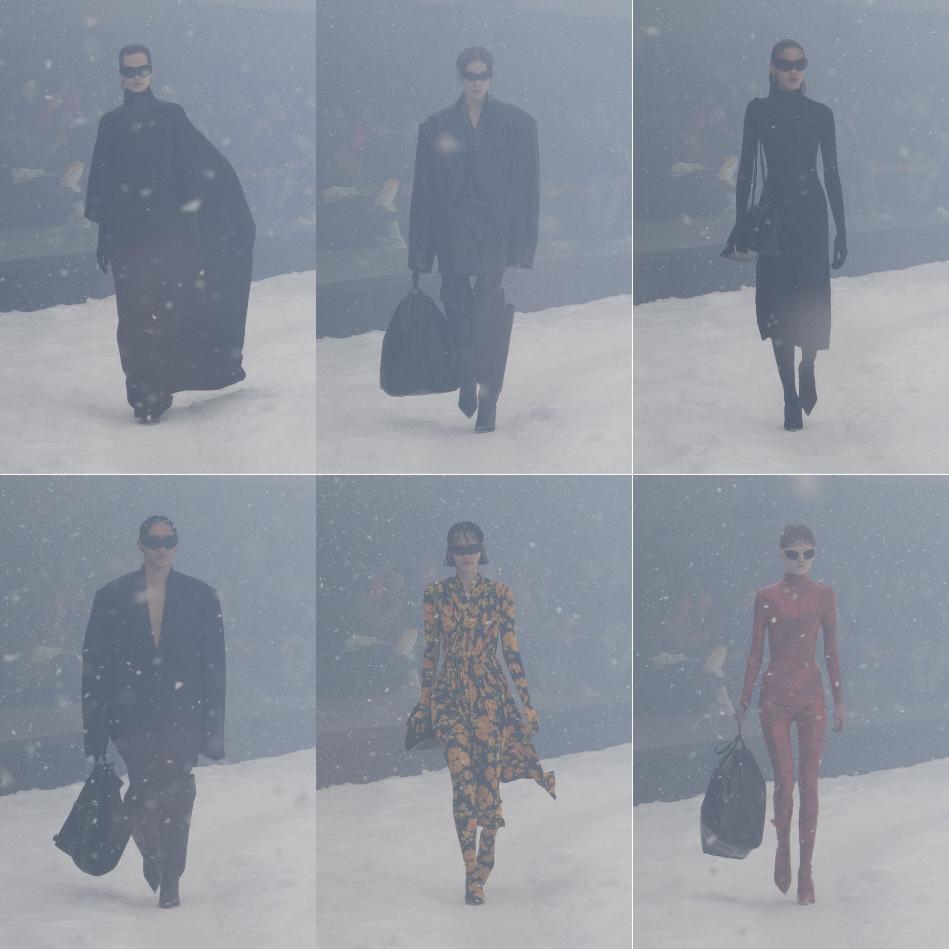It is not a show that’s easy to watch, not only because of what it evokes, but also because what is seen are mostly the teetering, and the mere silhouettes. These are identifiably Balenciaga silhouettes: beautiful but, at times, ghostly. In the fog of war and inclement weather, bagged-up shapes and floating trains could be either the bourgeoisie in escape or the peasantry in flight, or both. The models, with wet hair, appear to have just taken their last shower. There are the half-naked, covered by a blanket (or is that a towel?), plodding through the snow. Some of the outerwear look like there are taken off a neighbour’s clothesline. But others—the dresses—could be a refugee’s finest because even in fleeing, you’d want to look your best. Many of them carry bags that look like black versions of those used by hotels for laundry. Perhaps better to contain everything you wish to bring along at the last minute. As Demna told the press, he “made everything less madame, less bourgeois, less upper-class”. It is not hard to second that.