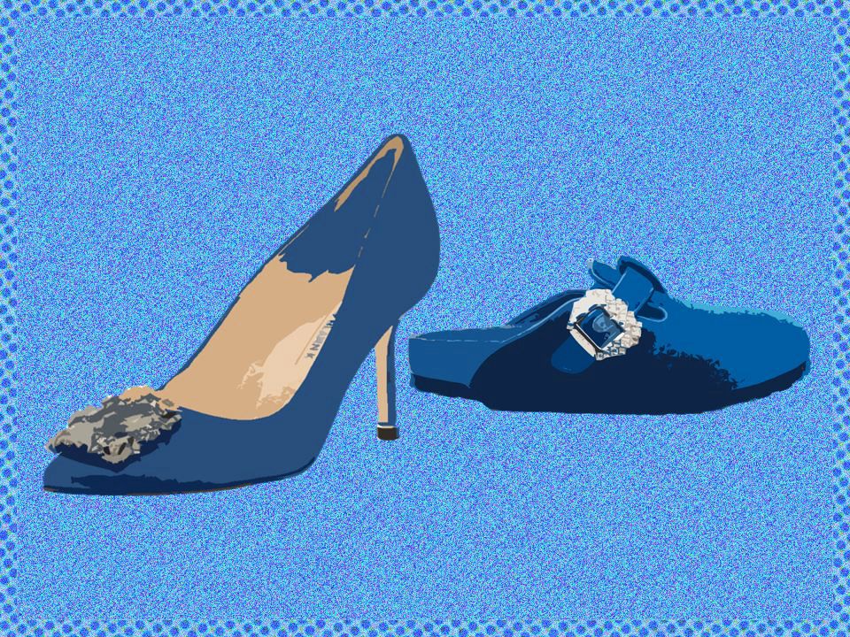 From this to that: Manolo Blahnik ‘Hangisi’ pumps and Manolo Blahnik X Birkenstock Boston clog