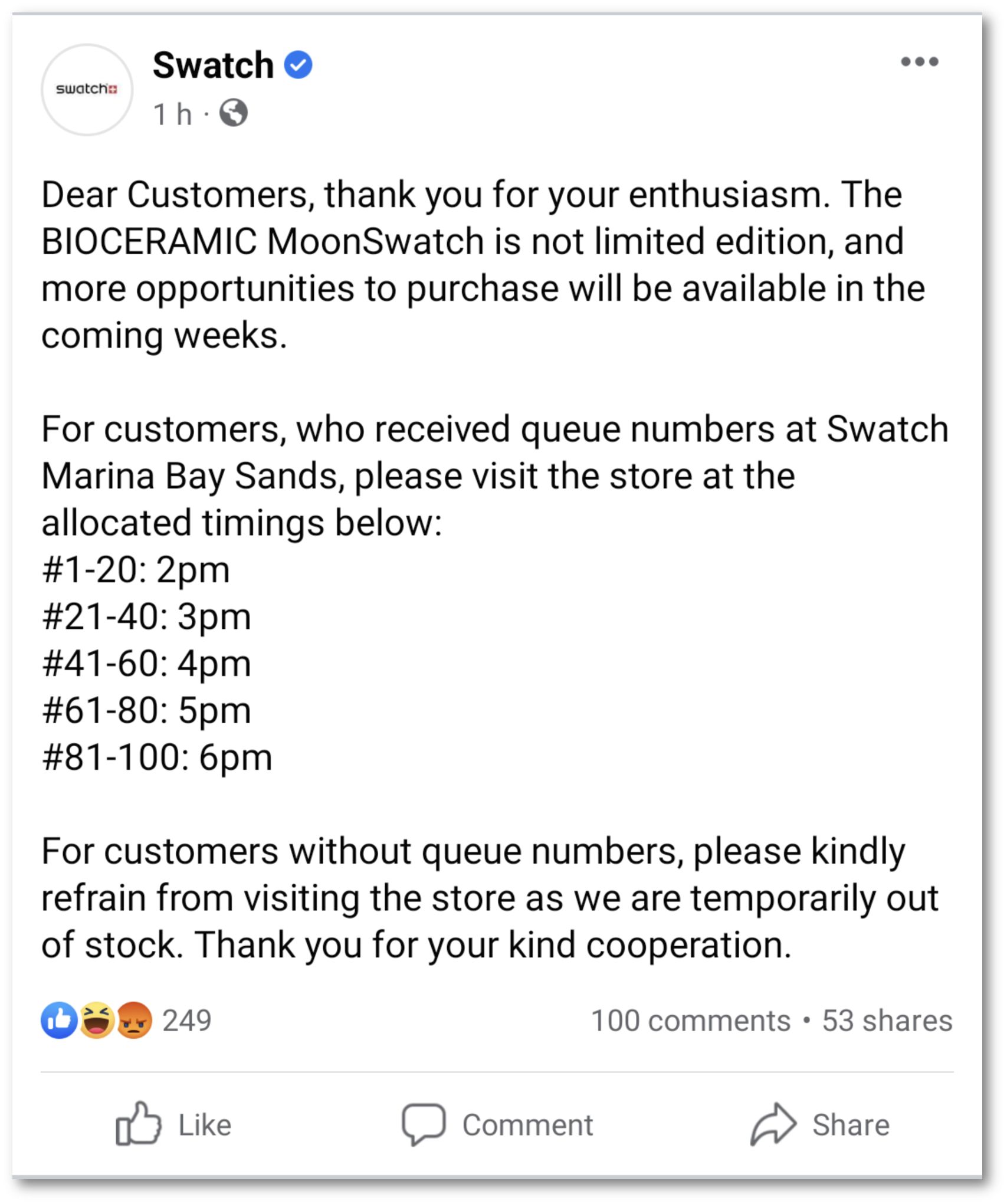 Update (26 March 2022, 1.30pm): Swatch has just posted on Facebook, urging those without a queue number “to kindly refrain from visiting the MBS store” where the MoonSwatch is available, as they “are temporarily out of stock”. One Marcus Song shared on the Swatch page, “It was mayhem at your Ion boutique and it was not possible to find a proper queue, I totally gave up and left”