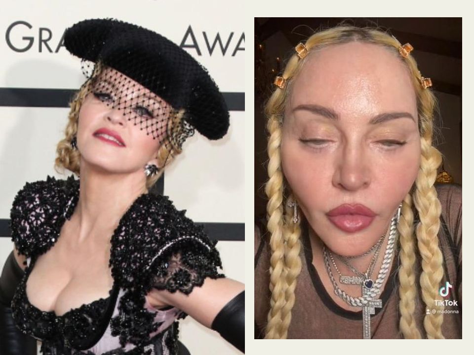 Madonna during the Grammys, then and now. Left, in February, 2015 and right, this week. Photo: Mega and TikTok respectively